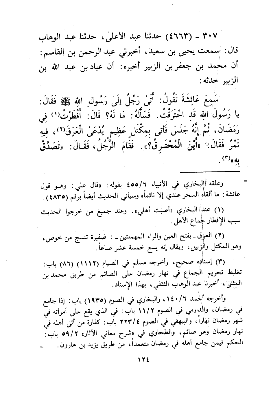 4663 - حَدَّثَنَا عَبْدُ الْأَعْلَى، حَدَّثَنَا عَبْدُ الْوَهَّابِ قَالَ: سَمِعْتُ يَحْيَى بْنَ سَعِيدٍ، أَخْبَرَنِي عَبْدُ الرَّحْمَنِ بْنُ الْقَاسِمِ، أَنَّ مُحَمَّدَ بْنَ جَعْفَرِ بْنِ الزُّبَيْرِ أَخْبَرَهُ، أَنَّ عَبَّادَ بْنَ عَبْدِ اللَّهِ بْنِ الزُّبَيْرِ حَدَّثَهُ سَمِعَ عَائِشَةَ تَقُولُ: أَتَى رَجُلٌ إِلَى رَسُولِ اللَّهِ صَلَّى اللهُ عَلَيْهِ وَسَلَّمَ فَقَالَ: " §يَا رَسُولَ اللَّهِ قَدِ احْتَرَقْتُ. فَسَأَلَهُ: «مَا لَهُ؟» قَالَ: أَفْطَرْتُ فِي رَمَضَانَ، ثُمَّ إِنَّهُ جَلَسَ فَأَتَى بِمِكْتَلٍ عَظِيمٍ يُدْعَى الْعَرَقَ فِيهِ تَمْرٌ، فَقَالَ: «أَيْنَ الْمُحْتَرِقُ؟» فَقَامَ الرَّجُلُ فَقَالَ: «تَصَدَّقْ بِهِ» Kإسناده صحيح