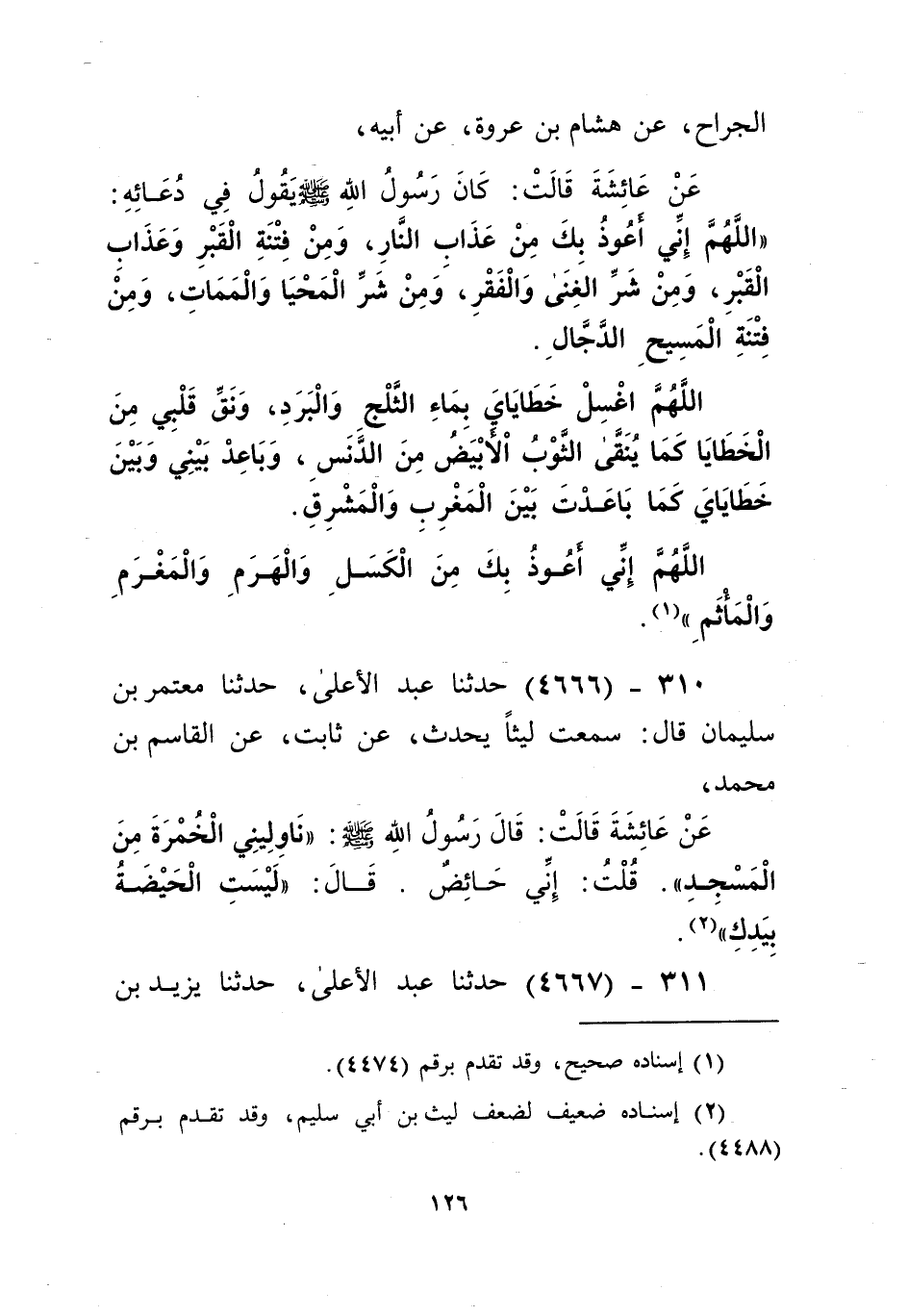 4666 - حَدَّثَنَا عَبْدُ الْأَعْلَى حَدَّثَنَا مُعْتَمِرُ بْنُ سُلَيْمَانَ قَالَ: سَمِعْتُ لَيْثًا يُحَدِّثُ، عَنْ ثَابِتٍ، عَنِ الْقَاسِمِ بْنِ مُحَمَّدٍ، عَنْ عَائِشَةَ قَالَتْ: قَالَ رَسُولُ اللَّهِ صَلَّى اللهُ عَلَيْهِ وَسَلَّمَ: «§نَاوِلِينِي الْخُمْرَةَ مِنَ الْمَسْجِدِ». قُلْتُ: إِنِّي حَائِضٌ. قَالَ: «لَيْسَتِ الْحَيْضَةُ بِيَدِكِ» Kإسناده ضعيف