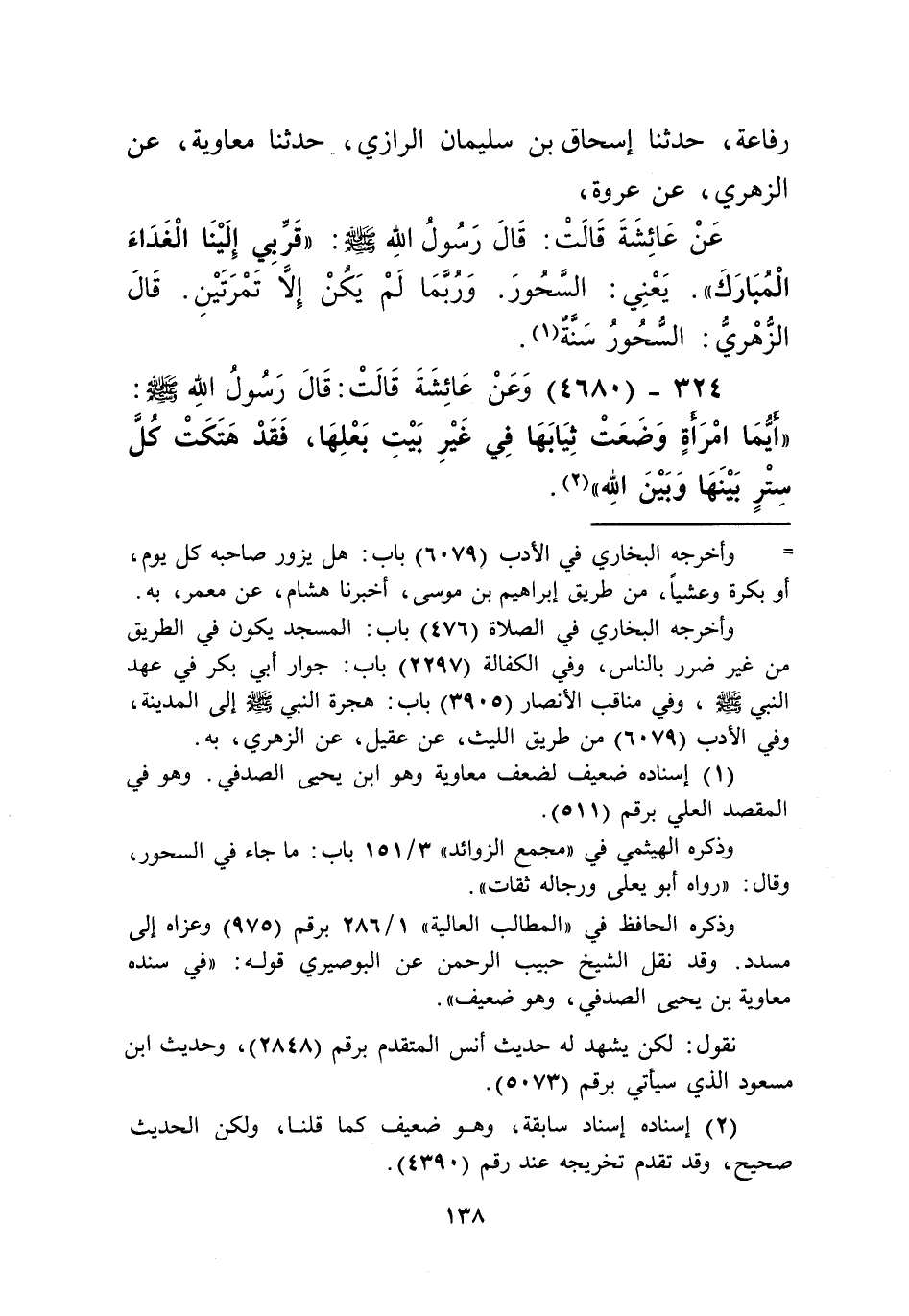 4679 - حَدَّثَنَا أَبُو هِشَامٍ مُحَمَّدُ بْنُ يَزِيدَ بْنِ رِفَاعَةَ، حَدَّثَنَا إِسْحَاقُ بْنُ سُلَيْمَانَ الرَّازِيُّ، حَدَّثَنَا مُعَاوِيَةُ، عَنِ الزُّهْرِيِّ، عَنْ عُرْوَةَ، عَنْ عَائِشَةَ قَالَتْ: قَالَ رَسُولُ اللَّهِ صَلَّى اللهُ عَلَيْهِ وَسَلَّمَ: «§قَرِّبِي إِلَيْنَا الْغَدَاءَ الْمُبَارَكَ» - يَعْنِي السَّحُورَ -، وَرُبَّمَا لَمْ يَكُنْ إِلَّا تَمْرَتَيْنِ. قَالَ الزُّهْرِيُّ: السَّحُورُ سُنَّةٌKإسناده ضعيف