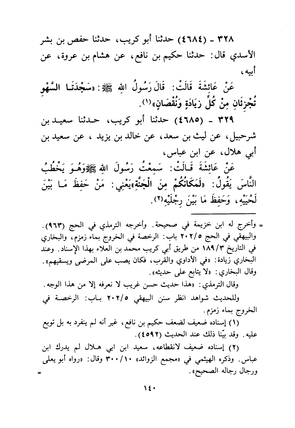 4684 - حَدَّثَنَا أَبُو كُرَيْبٍ، حَدَّثَنَا حَفْصُ بْنُ بِشْرٍ الْأَسَدِيُّ قَالَ: حَدَّثَنَا حَكِيمُ بْنُ نَافِعٍ، عَنْ هِشَامِ بْنِ عُرْوَةَ، عَنْ أَبِيهِ، عَنْ عَائِشَةَ قَالَتْ: قَالَ رَسُولُ اللَّهِ صَلَّى اللهُ عَلَيْهِ وَسَلَّمَ: «§سَجْدَتَا السَّهْو تُجْزِئَانِ مِنْ كُلِّ زِيَادَةٍ وَنُقْصَانٍ» Kإسناده ضعيف