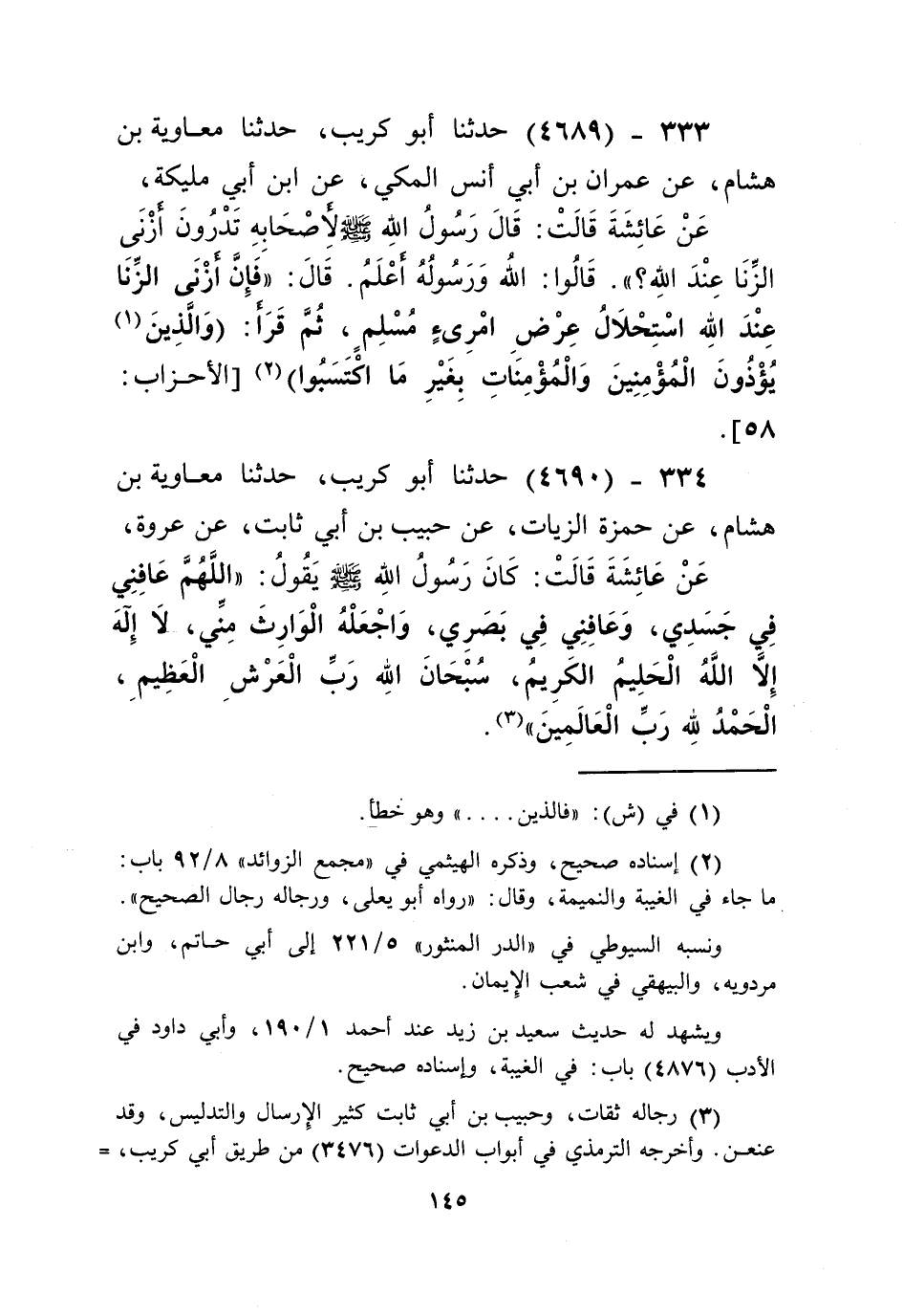 4690 - حَدَّثَنَا أَبُو كُرَيْبٍ، حَدَّثَنَا مُعَاوِيَةُ بْنُ هِشَامٍ، عَنْ حَمْزَةَ الزَّيَّاتِ، عَنْ حَبِيبِ بْنِ أَبِي ثَابِتٍ، عَنْ عُرْوَةَ، عَنْ عَائِشَةَ قَالَتْ: كَانَ رَسُولُ اللَّهِ صَلَّى اللهُ عَلَيْهِ وَسَلَّمَ يَقُولُ: «§اللَّهُمَّ عَافِنِي فِي جَسَدِي، وَعَافِنِي فِي بَصَرِي وَاجْعَلْهُ الْوَارِثَ مِنِّي. لَا إِلَهَ إِلَّا اللَّهُ الْحَلِيمُ الْكَرِيمُ سُبْحَانَ اللَّهِ رَبِّ الْعَرْشِ الْعَظِيمِ، الْحَمْدُ لِلَّهِ رَبِّ الْعَالَمِينَ» Kرجاله ثقات