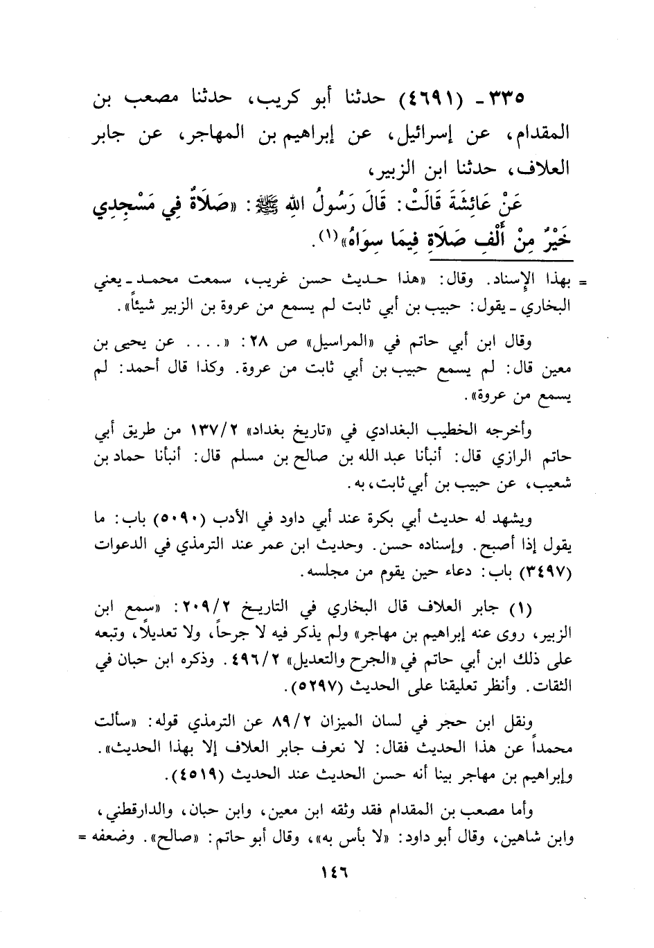 4691 - حَدَّثَنَا أَبُو كُرَيْبٍ، حَدَّثَنَا مُصْعَبُ بْنُ الْمِقْدَامِ، عَنْ إِسْرَائِيلَ، عَنْ إِبْرَاهِيمَ بْنِ الْمُهَاجِرِ، عَنْ جَابِرٍ الْعَلَّافِ، حَدَّثَنَا ابْنُ الزُّبَيْرِ، عَنْ عَائِشَةَ قَالَتْ: قَالَ رَسُولُ اللَّهِ صَلَّى اللهُ عَلَيْهِ وَسَلَّمَ: «§صَلَاةٌ فِي مَسْجِدِي خَيْرٌ مِنْ أَلْفِ صَلَاةٍ فِيمَا سِوَاهُ»