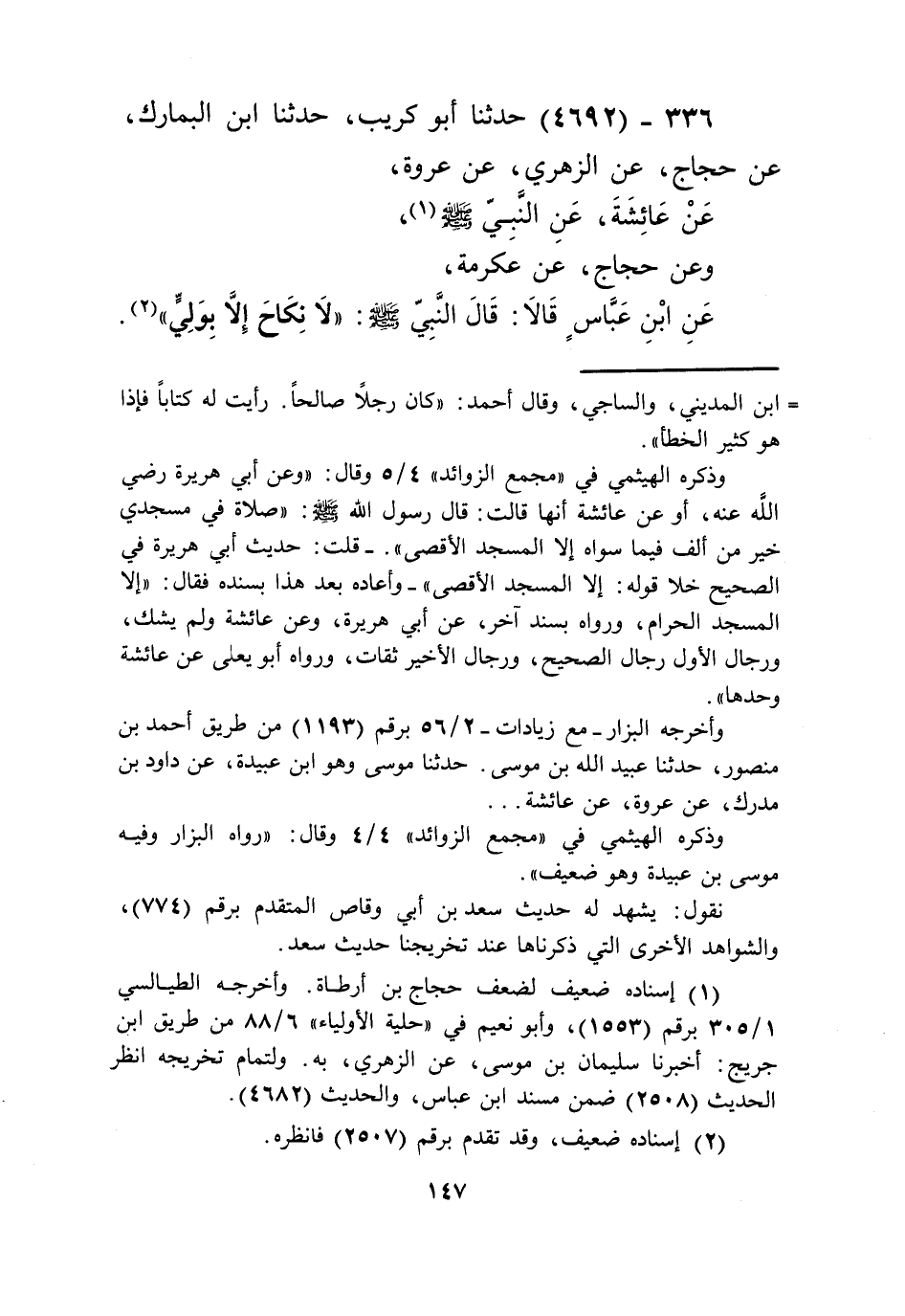 4692 - حَدَّثَنَا أَبُو كُرَيْبٍ، حَدَّثَنَا ابْنُ الْمُبَارَكِ، عَنْ حَجَّاجٍ، عَنِ الزُّهْرِيِّ، عَنْ عُرْوَةَ، عَنْ عَائِشَةَ، عَنِ النَّبِيِّ صَلَّى اللهُ عَلَيْهِ وَسَلَّمَ: وَعَنْ حَجَّاجٍ، عَنْ عِكْرِمَةَ، عَنِ ابْنِ عَبَّاسٍ قَالَا: قَالَ النَّبِيُّ صَلَّى اللهُ عَلَيْهِ وَسَلَّمَ: «§لَا نِكَاحَ إِلَّا بِوَلِيٍّ». وَفِي حَدِيثِ عُرْوَةَ: «وَالسُّلْطَانُ وَلِيُّ مَنْ لَا وَلِيَّ لَهُ» Kإسناده ضعيف