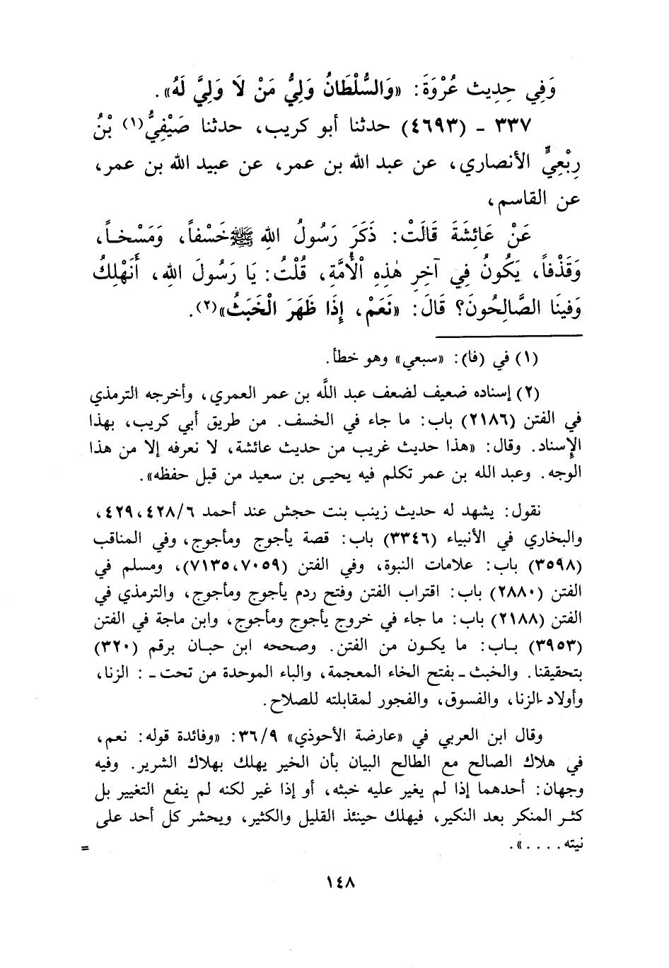 4693 - حَدَّثَنَا أَبُو كُرَيْبٍ، حَدَّثَنَا صَيْفِيُّ بْنُ رِبْعِيٍّ الْأَنْصَارِيُّ، عَنْ عَبْدِ اللَّهِ بْنِ عُمَرَ، عَنْ عُبَيْدِ اللَّهِ بْنِ عُمَرَ، عَنِ الْقَاسِمِ، عَنْ عَائِشَةَ قَالَتْ: " §ذَكَرَ رَسُولُ اللَّهِ صَلَّى اللهُ عَلَيْهِ وَسَلَّمَ خَسْفًا وَمَسْخًا وَقَذْفًا يَكُونُ فِي آخِرِ هَذِهِ الْأُمَّةِ. قُلْتُ: يَا رَسُولَ اللَّهِ أَنَهْلِكُ وَفِينَا الصَّالِحُونَ؟ قَالَ: «نَعَمْ. إِذَا ظَهَرَ الْخَبَثُ» Kإسناده ضعيف