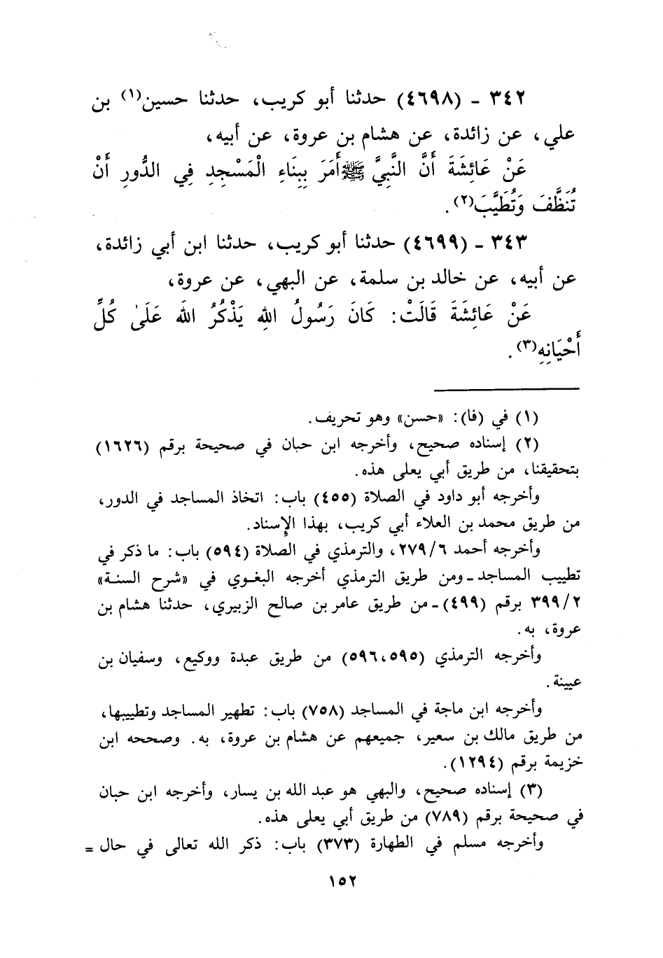 4698 - حَدَّثَنَا أَبُو كُرَيْبٍ، حَدَّثَنَا حُسَيْنُ بْنُ عَلِيٍّ، عَنْ زَائِدَةَ، عَنْ هِشَامِ بْنِ عُرْوَةَ، عَنْ أَبِيهِ، عَنْ عَائِشَةَ، أَنَّ النَّبِيَّ صَلَّى اللهُ عَلَيْهِ وَسَلَّمَ «§أَمَرَ بِبِنَاءِ الْمَسْجِدِ فِي الدُّورِ أَنْ تُنَظَّفَ وَتُطَيَّبَ» Kإسناده صحيح