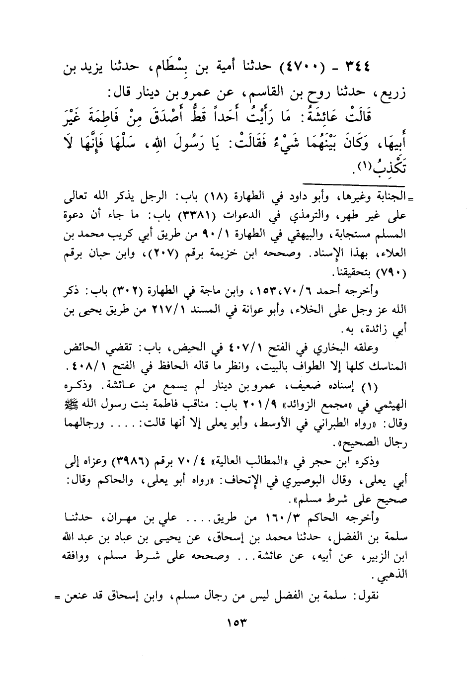 4700 - حَدَّثَنَا أُمَيَّةُ بْنُ بِسْطَامٍ، حَدَّثَنَا يَزِيدُ بْنُ زُرَيْعٍ، حَدَّثَنَا رَوْحُ بْنُ الْقَاسِمِ، عَنْ عَمْرِو بْنِ دِينَارٍ قَالَ: قَالَتْ عَائِشَةُ: " §مَا رَأَيْتُ أَحَدًا قَطُّ أَصَدَقَ مِنْ فَاطِمَةَ غَيْرَ أَبِيهَا، وَكَانَ بَيْنَهُمَا شَيْءٌ فَقَالَتْ: يَا رَسُولَ اللَّهِ سَلْهَا؛ فَإِنَّهَا لَا تَكْذِبُ "Kإسناده ضعيف