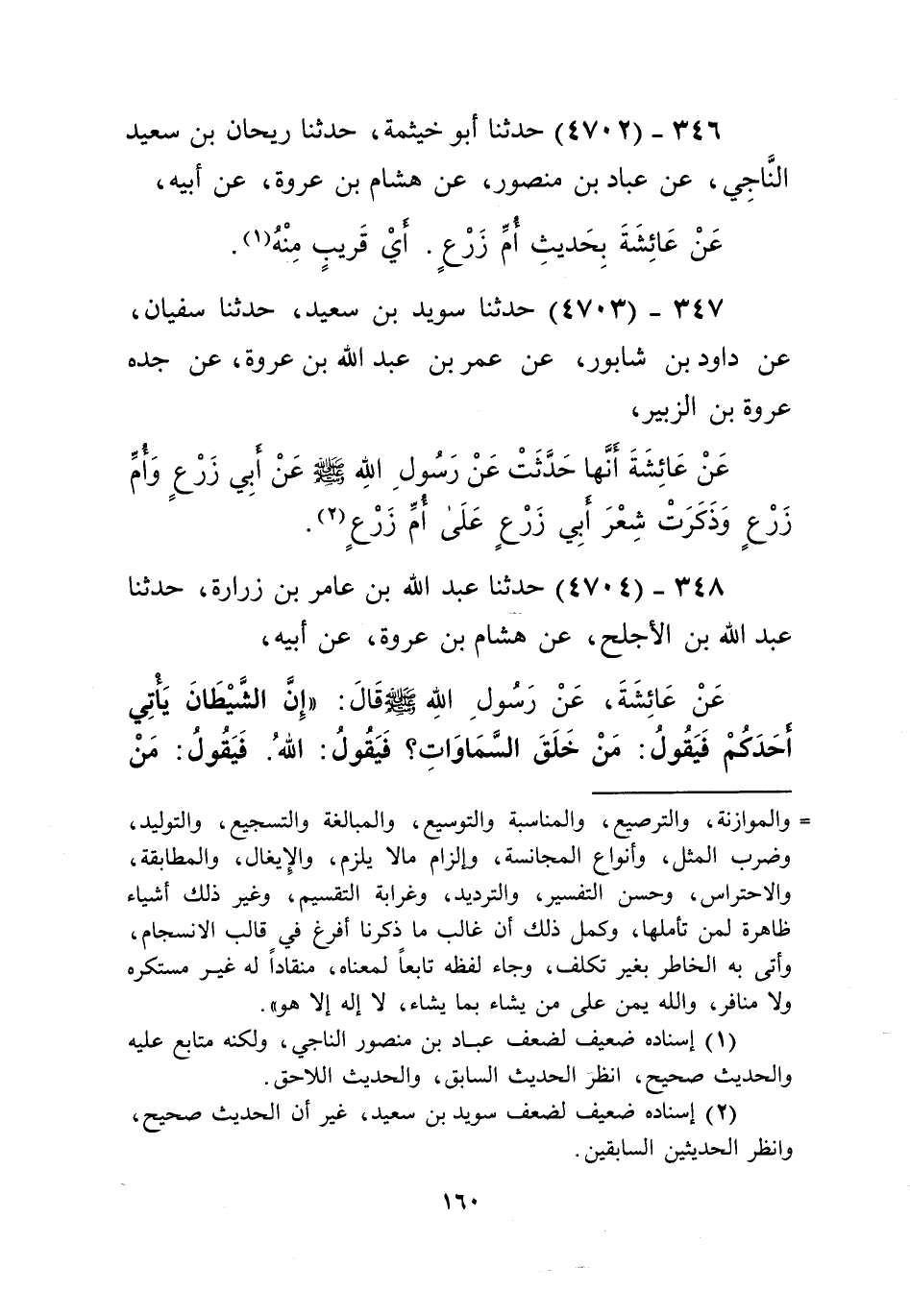 4704 - حَدَّثَنَا عَبْدُ اللَّهِ بْنُ عَامِرِ بْنِ زُرَارَةَ، حَدَّثَنَا عَبْدُ اللَّهِ بْنُ الْأَجْلَحِ، عَنْ هِشَامِ بْنِ عُرْوَةَ، عَنْ أَبِيهِ، عَنْ عَائِشَةَ، عَنْ رَسُولِ اللَّهِ صَلَّى اللهُ عَلَيْهِ وَسَلَّمَ قَالَ: " §إِنَّ الشَّيْطَانَ يَأْتِي أَحَدَكُمْ فَيَقُولُ: مَنْ خَلَقَ السَّمَاوَاتِ؟ فَيَقُولُ: اللَّهُ. فَيَقُولُ: مَنْ خَلَقَ الْأَرْضَ؟ فَيَقُولُ: اللَّهُ. فَيَقُولُ: مَنْ خَلَقَ اللَّهَ؟ فَإِذَا كَانَ ذَلِكَ فَلْيَقُلْ: آمَنْتُ بِاللَّهِ وَرُسُلِهِ "Kإسناده صحيح