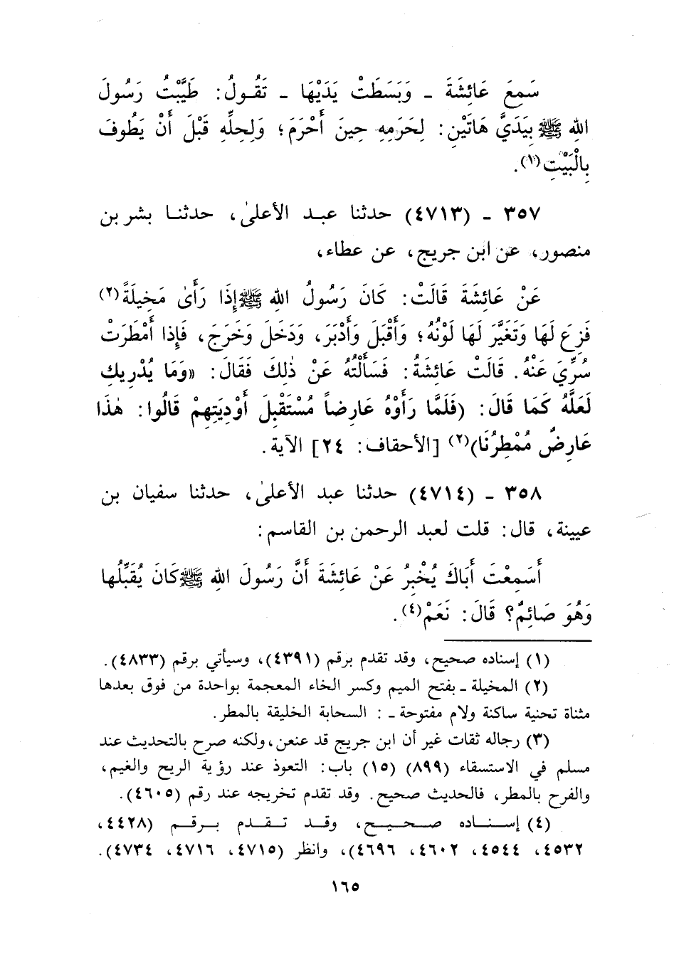 4713 - حَدَّثَنَا عَبْدُ الْأَعْلَى، حَدَّثَنَا بِشْرُ بْنُ مَنْصُورٍ، عَنِ ابْنِ جُرَيْجٍ، عَنْ عَطَاءٍ، عَنْ عَائِشَةَ قَالَتْ: كَانَ رَسُولُ اللَّهِ صَلَّى اللهُ عَلَيْهِ وَسَلَّمَ " §إِذَا رَأَى مَخِيلَةً فَزِعَ لَهَا وَتَغَيَّرَ لَهَا لَوْنُهُ، وَأَقْبَلَ وَأَدْبَرَ، وَدَخَلَ وَخَرَجَ، فَإِذَا أَمْطَرَتْ سُرِّيَ عَنْهُ. قَالَتْ عَائِشَةُ: فَسَأَلْتُهُ عَنْ ذَلِكَ فَقَالَ: " وَمَا يُدْرِيكِ لَعَلَّهُ كَمَا قَالَ: {فَلَمَّا رَأَوْهُ عَارِضًا مُسْتَقْبِلَ أَوْدِيَتِهِمْ قَالُوا هَذَا عَارِضٌ مُمْطِرُنَا} [الأحقاف: 24] "Kرجاله ثقات