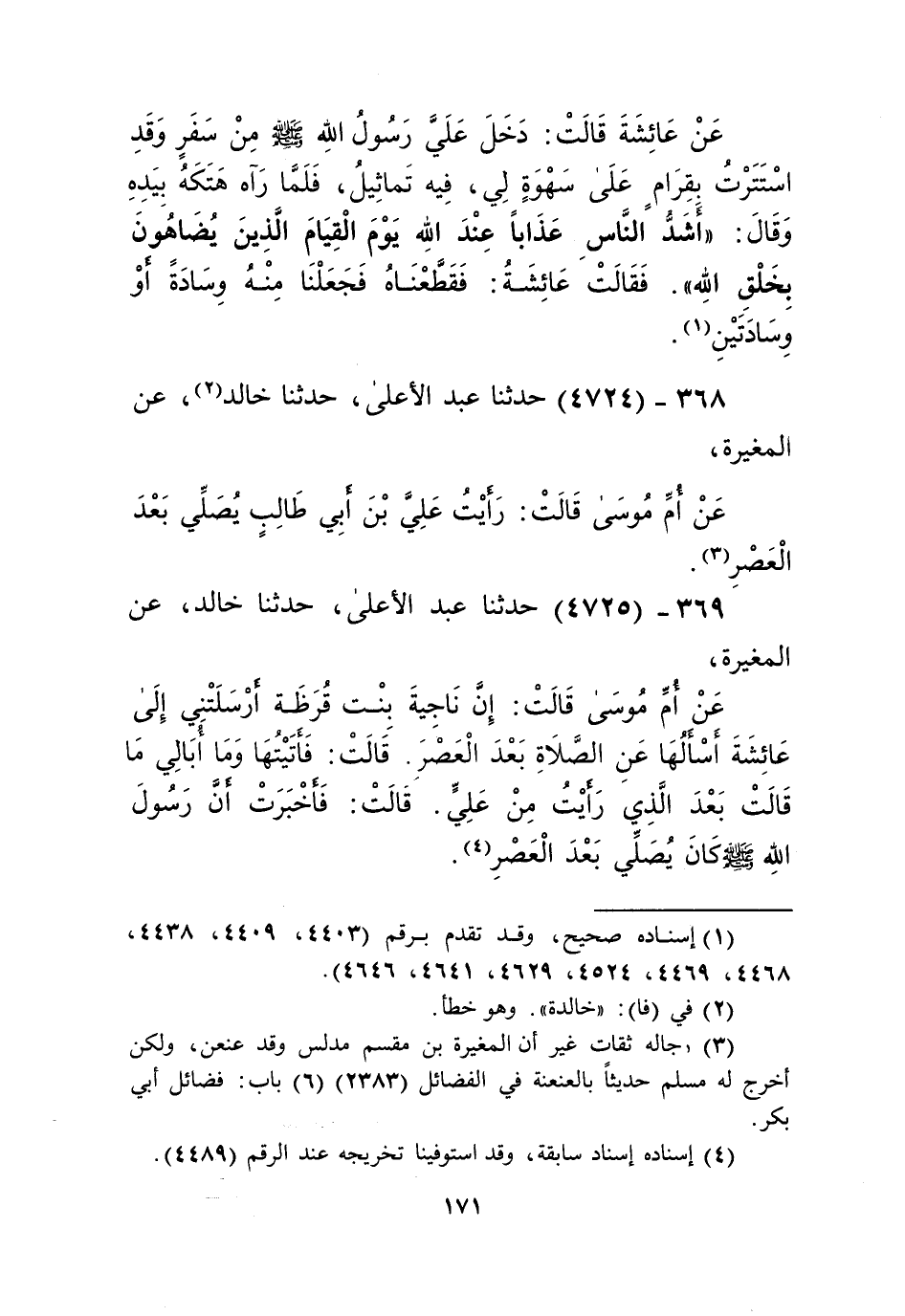 4724 - حَدَّثَنَا عَبْدُ الْأَعْلَى، حَدَّثَنَا خَالِدٌ، عَنِ الْمُغِيرَةِ، عَنْ أُمِّ مُوسَى قَالَتْ: رَأَيْتُ عَلِيَّ بْنَ أَبِي طَالِبٍ «§يُصَلِّي بَعْدَ الْعَصْرِ» Kرجاله ثقات