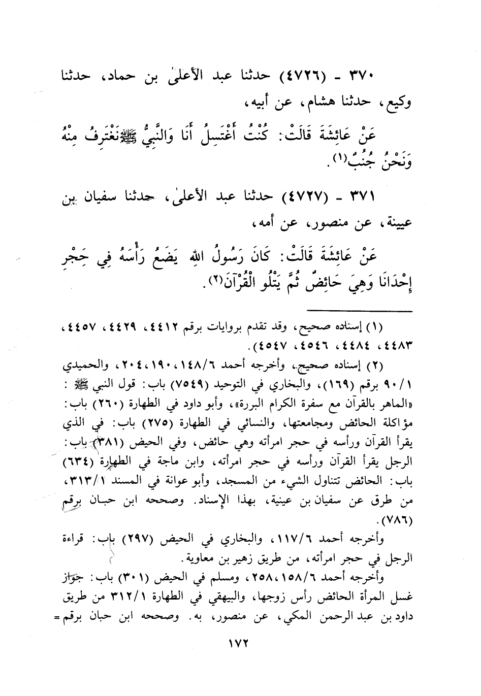 4727 - حَدَّثَنَا عَبْدُ الْأَعْلَى، حَدَّثَنَا سُفْيَانُ بْنُ عُيَيْنَةَ، عَنْ مَنْصُورٍ، عَنْ أُمِّهِ، عَنْ عَائِشَةَ قَالَتْ: كَانَ رَسُولُ اللَّهِ صَلَّى اللهُ عَلَيْهِ وَسَلَّمَ «§يَضَعُ رَأْسَهُ فِي حِجْرِ إِحْدَانَا وَهِيَ حَائِضٌ، ثُمَّ يَتْلُو الْقُرْآنَ» Kإسناده صحيح