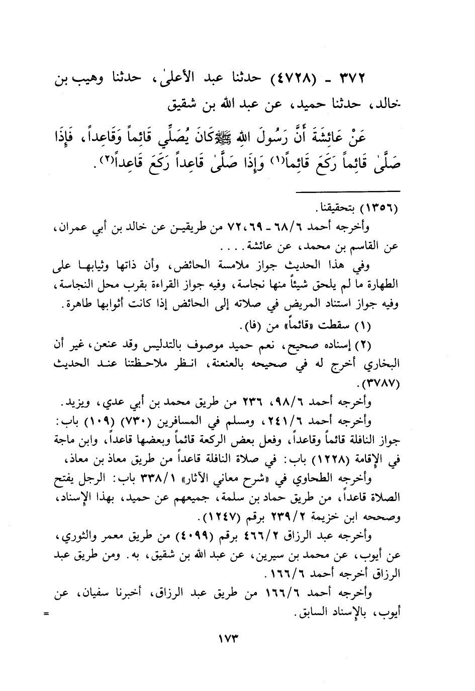 4728 - حَدَّثَنَا عَبْدُ الْأَعْلَى، حَدَّثَنَا وُهَيْبُ بْنُ خَالِدٍ، حَدَّثَنَا حُمَيْدٌ، عَنْ عَبْدِ اللَّهِ بْنِ شَقِيقٍ، عَنْ عَائِشَةَ، أَنَّ رَسُولَ اللَّهِ صَلَّى اللهُ عَلَيْهِ وَسَلَّمَ كَانَ «§يُصَلِّي قَائِمًا وَقَاعِدًا، فَإِذَا صَلَّى قَائِمًا رَكَعَ قَائِمًا، وَإِذَا صَلَّى قَاعِدًا رَكَعَ قَاعِدًا» Kإسناده صحيح