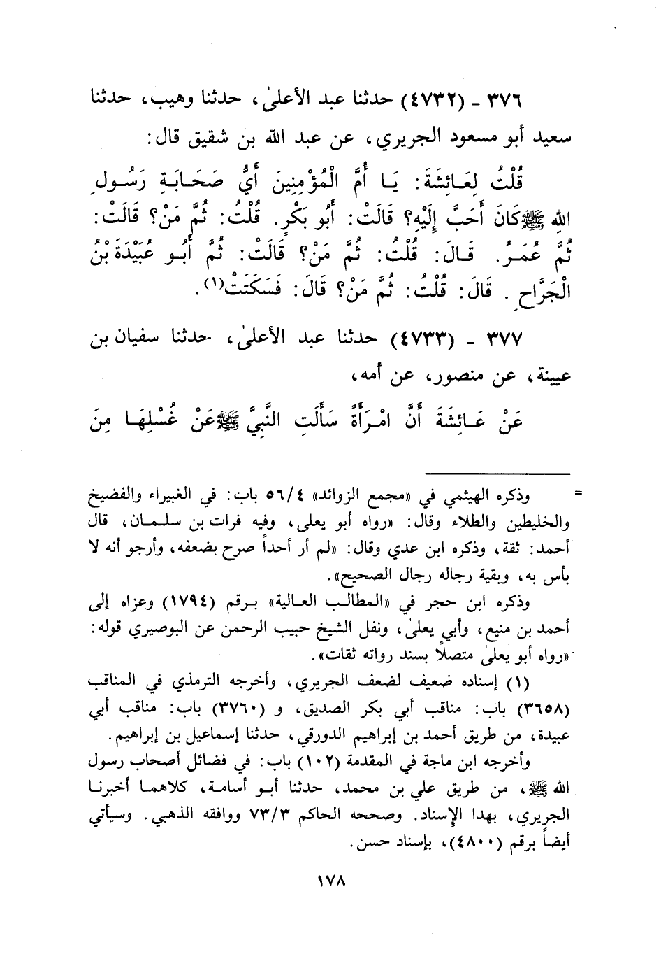 4732 - حَدَّثَنَا عَبْدُ الْأَعْلَى، حَدَّثَنَا وُهَيْبٌ، حَدَّثَنَا سَعِيدٌ أَبُو مَسْعُودٍ الْجُرَيْرِيُّ، عَنْ عَبْدِ اللَّهِ بْنِ شَقِيقٍ قَالَ: قُلْتُ لِعَائِشَةَ: يَا أُمَّ الْمُؤْمِنِينَ " §أَيُّ صَحَابَةِ رَسُولِ اللَّهِ صَلَّى اللهُ عَلَيْهِ وَسَلَّمَ كَانَ أَحَبَّ إِلَيْهِ؟ قَالَتْ: أَبُو بَكْرٍ. قُلْتُ: ثُمَّ مَنْ؟ قَالَتْ: ثُمَّ عُمَرُ. قَالَ: قُلْتُ: ثُمَّ مَنْ؟ قَالَتْ: ثُمَّ أَبُو عُبَيْدَةَ بْنُ الْجَرَّاحِ. قَالَ: قُلْتُ: ثُمَّ مَنْ؟ قَالَ: فَسَكَتَتْ "Kإسناده ضعيف