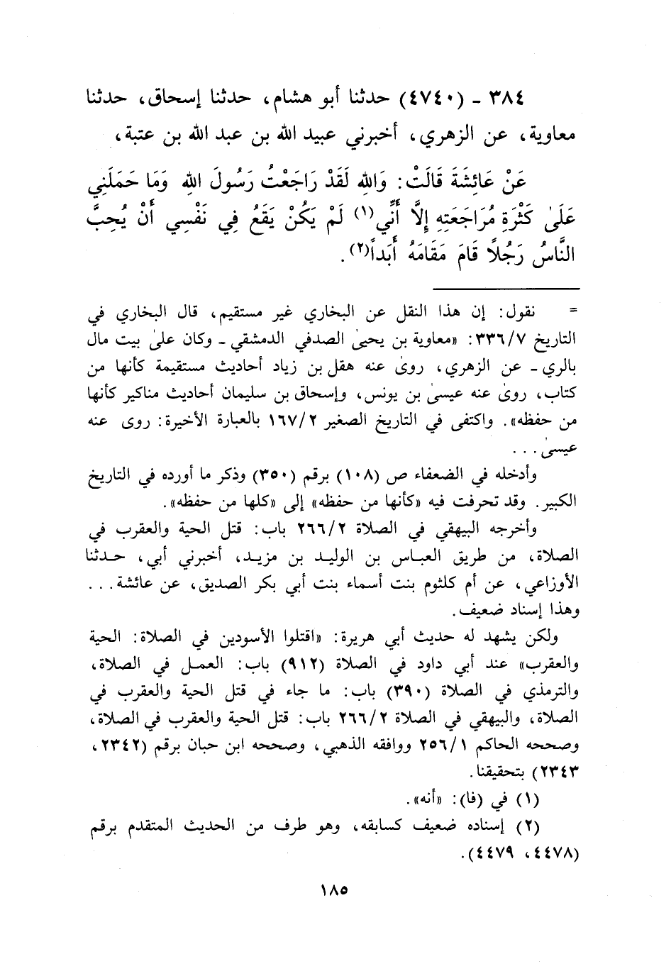 4740 - حَدَّثَنَا أَبُو هِشَامٍ، حَدَّثَنَا إِسْحَاقُ، حَدَّثَنَا مُعَاوِيَةُ، عَنِ الزُّهْرِيِّ، أَخْبَرَنِي عُبَيْدُ اللَّهِ بْنُ عَبْدِ اللَّهِ بْنِ عُتْبَةَ، عَنْ عَائِشَةَ قَالَتْ: «§وَاللَّهِ لَقَدْ رَاجَعْتُ رَسُولَ اللَّهِ صَلَّى اللهُ عَلَيْهِ وَسَلَّمَ، وَمَا حَمَلَنِي عَلَى كَثْرَةِ مُرَاجَعَتِهِ إِلَّا أَنِّي لَمْ يَكُنْ يَقَعُ فِي نَفْسِي أَنْ يُحِبَّ النَّاسُ رَجُلًا قَامَ مَقَامَهُ أَبَدًا» Kإسناده ضعيف