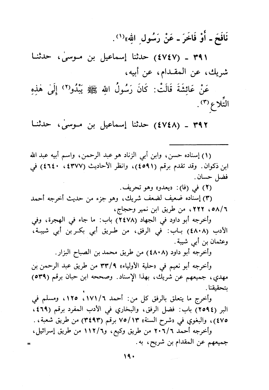 4747 - حَدَّثَنَا إِسْمَاعِيلُ بْنُ مُوسَى، حَدَّثَنَا شَرِيكٌ، عَنِ الْمِقْدَامِ، عَنْ أَبِيهِ، عَنْ عَائِشَةَ قَالَتْ: «§كَانَ رَسُولُ اللَّهِ صَلَّى اللهُ عَلَيْهِ وَسَلَّمَ يَبْدُو إِلَى هَذِهِ التِّلَاعِ» Kإسناده ضعيف