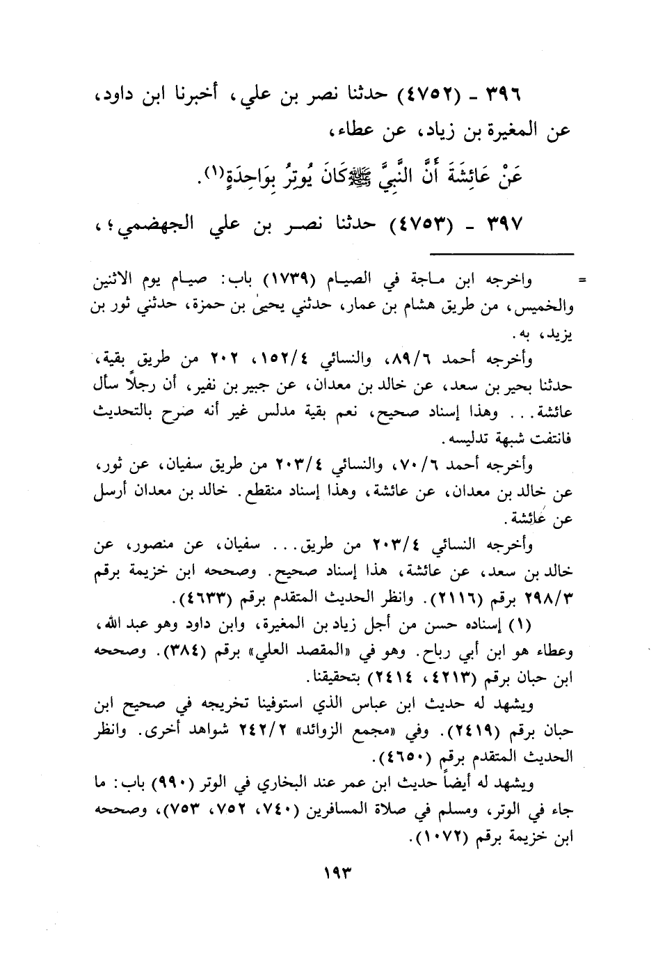 4752 - حَدَّثَنَا نَصْرُ بْنُ عَلِيٍّ، أَخْبَرَنَا ابْنُ دَاوُدَ، عَنِ الْمُغِيرَةِ بْنِ زِيَادٍ، عَنْ عَطَاءٍ، عَنْ عَائِشَةَ أَنَّ النَّبِيَّ صَلَّى اللهُ عَلَيْهِ وَسَلَّمَ «§كَانَ يُوتِرُ بِوَاحِدَةٍ» Kإسناده حسن