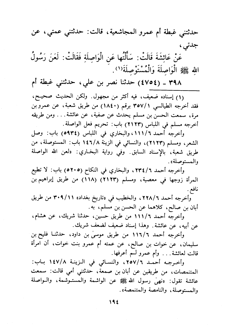 4754 - حَدَّثَنَا نَصْرُ بْنُ عَلِيٍّ، حَدَّثَتْنِي غِبْطَةُ أُمُّ عَمْرٍو - عَجُوزٌ مِنْ بَنِي مُجَاشِعٍ - حَدَّثَتْنِي عَمَّتِي، عَنْ جَدَّتِي، عَنْ عَائِشَةَ قَالَتْ: " §جَاءَتْ هِنْدُ بِنْتُ عُتْبَةَ بْنِ رَبِيعَةَ إِلَى رَسُولِ اللَّهِ صَلَّى اللهُ عَلَيْهِ وَسَلَّمَ لِتُبَايِعَهُ، فَنَظَرَ إِلَى يَدَيْهَا فَقَالَ لَهَا: «اذْهَبِي فَغَيِّرِي يَدَكِ». قَالَ: فَذَهَبَتْ فَغَيَّرَتْهَا بِحِنَّاءٍ، ثُمَّ جَاءَتْ إِلَى رَسُولِ اللَّهِ صَلَّى اللهُ عَلَيْهِ وَسَلَّمَ فَقَالَ: «أُبَايِعُكِ عَلَى أَنْ لَا تُشْرِكِي بِاللَّهِ شَيْئًا وَلَا تَسْرِقِي وَلَا تَزْنِي». قَالَتْ: أَوَ تَزْنِي الْحُرَّةُ؟ قَالَ: «وَلَا تَقْتُلَنَّ أَوْلَادَكُنَّ خَشْيَةَ إِمْلَاقٍ». قَالَتْ: وَهَلْ تَرَكْتَ لَنَا أَوْلَادًا نَقْتُلُهُمْ؟ قَالَ: فَبَايَعَتْهُ ثُمَّ قَالَتْ لَهُ وَعَلَيْهَا سِوَارَانِ مِنْ ذَهَبٍ مَا تَقُولُ فِي هَذَيْنِ السِّوَارَيْنِ؟ قَالَ: «جَمْرَتَانِ مِنْ جَمْرِ جَهَنَّمَ» Kإسناده ضعيف