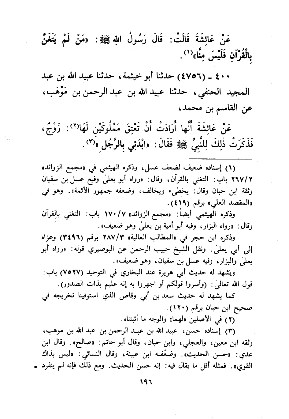 4756 - حَدَّثَنَا أَبُو خَيْثَمَةَ، حَدَّثَنَا عُبَيْدُ اللَّهِ بْنُ عَبْدِ الْمَجِيدِ الْحَنَفِيُّ، حَدَّثَنَا عُبَيْدُ اللَّهِ بْنُ عَبْدِ الرَّحْمَنِ بْنِ مَوْهَبٍ، عَنِ الْقَاسِمِ بْنِ مُحَمَّدٍ، عَنْ عَائِشَةَ أَنَّهَا " §أَرَادَتْ أَنْ تَعْتِقَ مَمْلُوكَيْنِ لَهَا زَوْجٌ، فَذَكَرَتْ ذَلِكَ لِلنَّبِيِّ صَلَّى اللهُ عَلَيْهِ وَسَلَّمَ فَقَالَ: «ابْدَئِي بِالرَّجُلِ» Kإسناده حسن