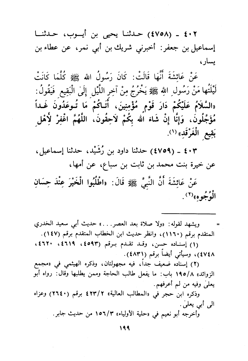 4758 - حَدَّثَنَا يَحْيَى بْنُ أَيُّوبَ، حَدَّثَنَا إِسْمَاعِيلُ بْنُ جَعْفَرٍ، أَخْبَرَنِي شَرِيكُ بْنُ أَبِي نَمِرٍ، عَنْ عَطَاءِ بْنِ يَسَارٍ، عَنْ عَائِشَةَ أَنَّهَا قَالَتْ: كَانَ رَسُولُ اللَّهِ صَلَّى اللهُ عَلَيْهِ وَسَلَّمَ كُلَّمَا كَانَتْ لَيْلَتُهَا مِنْ رَسُولِ اللَّهِ صَلَّى اللهُ عَلَيْهِ وَسَلَّمَ " §يَخْرُجُ مِنْ آخِرِ اللَّيْلِ إِلَى الْبَقِيعِ فَيَقُولُ: «السَّلَامُ عَلَيْكُمْ دَارَ قَوْمٍ مُؤْمِنِينَ. أَتَاكُمْ مَا تُوعَدُونَ غَدًا مُؤَجَّلُونَ، وَإِنَّا إِنْ شَاءَ اللَّهُ بِكُمْ لَاحِقُونَ. اللَّهُمَّ اغْفِرْ لِأَهْلِ بَقِيعِ الْغَرْقَدِ» Kإسناده حسن