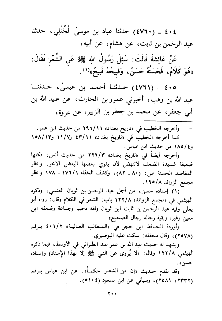 4760 - حَدَّثَنَا عَبَّادُ بْنُ مُوسَى الْخُتُلِّيُّ، حَدَّثَنَا عَبْدُ الرَّحْمَنِ بْنُ ثَابِتٍ، عَنْ هِشَامٍ، عَنْ أَبِيهِ، عَنْ عَائِشَةَ قَالَتْ: " §سُئِلَ رَسُولُ اللَّهِ صَلَّى اللهُ عَلَيْهِ وَسَلَّمَ عَنِ الشِّعْرِ. فَقَالَ: «هُوَ كَلَامٌ. فَحَسَنُهُ حَسَنٌ وَقَبِيحُهُ قَبِيحٌ» Kإسناده حسن