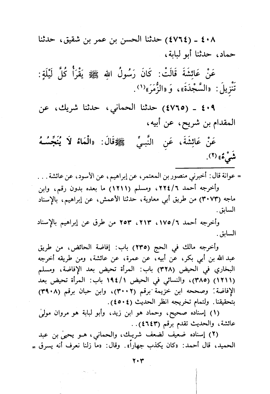 4764 - حَدَّثَنَا الْحَسَنُ بْنُ عُمَرَ بْنِ شَقِيقٍ، حَدَّثَنَا حَمَّادٌ، حَدَّثَنَا أَبُو لُبَابَةَ، عَنْ عَائِشَةَ قَالَتْ: كَانَ رَسُولُ اللَّهِ صَلَّى اللهُ عَلَيْهِ وَسَلَّمَ «§يَقْرَأُ كُلَّ لَيْلَةٍ تَنْزِيلَ السَّجْدَةِ وَالزُّمَرَ» Kإسناده صحيح