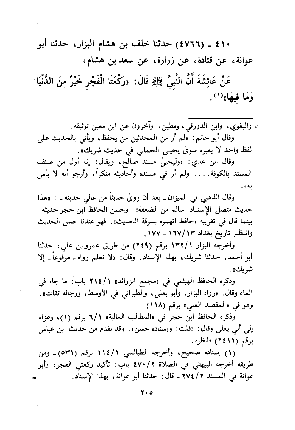 4766 - حَدَّثَنَا خَلَفُ بْنُ هِشَامٍ الْبَزَّارُ، حَدَّثَنَا أَبُو عَوَانَةَ، عَنْ قَتَادَةَ، عَنْ زُرَارَةَ، عَنْ سَعْدِ بْنِ هِشَامٍ، عَنْ عَائِشَةَ، أَنَّ النَّبِيَّ صَلَّى اللهُ عَلَيْهِ وَسَلَّمَ قَالَ: «§رَكْعَتَا الْفَجْرِ خَيْرٌ مِنَ الدُّنْيَا وَمَا فِيهَا» Kإسناده صحيح