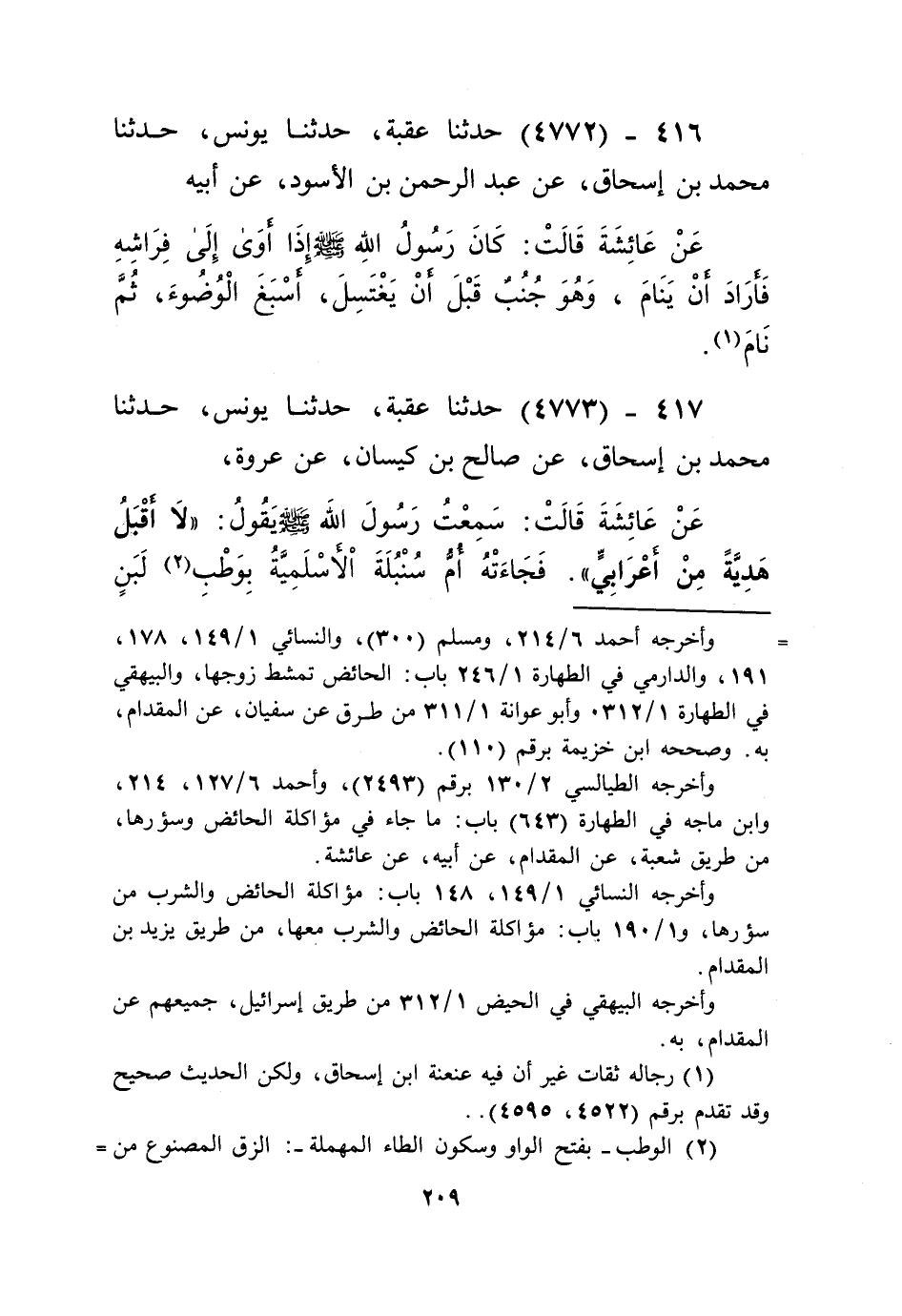 4772 - حَدَّثَنَا عُقْبَةُ، حَدَّثَنَا يُونُسُ، حَدَّثَنَا مُحَمَّدُ بْنُ إِسْحَاقَ، عَنْ عَبْدِ الرَّحْمَنِ بْنِ الْأَسْوَدِ، عَنْ أَبِيهِ، عَنْ عَائِشَةَ قَالَتْ: كَانَ رَسُولُ اللَّهِ صَلَّى اللهُ عَلَيْهِ وَسَلَّمَ «§إِذَا أَوَى إِلَى فِرَاشِهِ فَأَرَادَ أَنْ يَنَامَ، وَهُوَ جُنُبٌ قَبْلَ أَنْ يَغْتَسِلَ أَسْبَغَ الْوُضُوءَ ثُمَّ نَامَ» Kرجاله ثقات ولكن الحديث صحيح