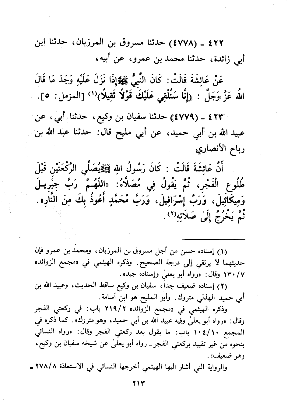 4779 - حَدَّثَنَا سُفْيَانُ بْنُ وَكِيعٍ، حَدَّثَنَا أَبِي، عَنْ عُبَيْدِ اللَّهِ بْنِ أَبِي حُمَيْدٍ، عَنْ أَبِي مَلِيحٍ قَالَ: حَدَّثَنَا عَبْدُ اللَّهِ بْنُ رَبَاحٍ الْأَنْصَارِيُّ، أَنَّ عَائِشَةَ قَالَتْ: كَانَ رَسُولُ اللَّهِ صَلَّى اللهُ عَلَيْهِ وَسَلَّمَ " §يُصَلِّي الرَّكْعَتَيْنِ قَبْلَ طُلُوعِ الْفَجْرِ، ثُمَّ يَقُولُ فِي مُصَلَّاهُ: «اللَّهُمَّ رَبَّ جِبْرِيلَ وَمِيكَائِيلَ وَرَبَّ إِسْرَافِيلَ وَرَبَّ مُحَمَّدٍ أَعُوذُ بِكَ مِنَ النَّارِ» ثُمَّ يَخْرُجُ إِلَى صَلَاتِهِ.Kإسناده ضعيف جدا