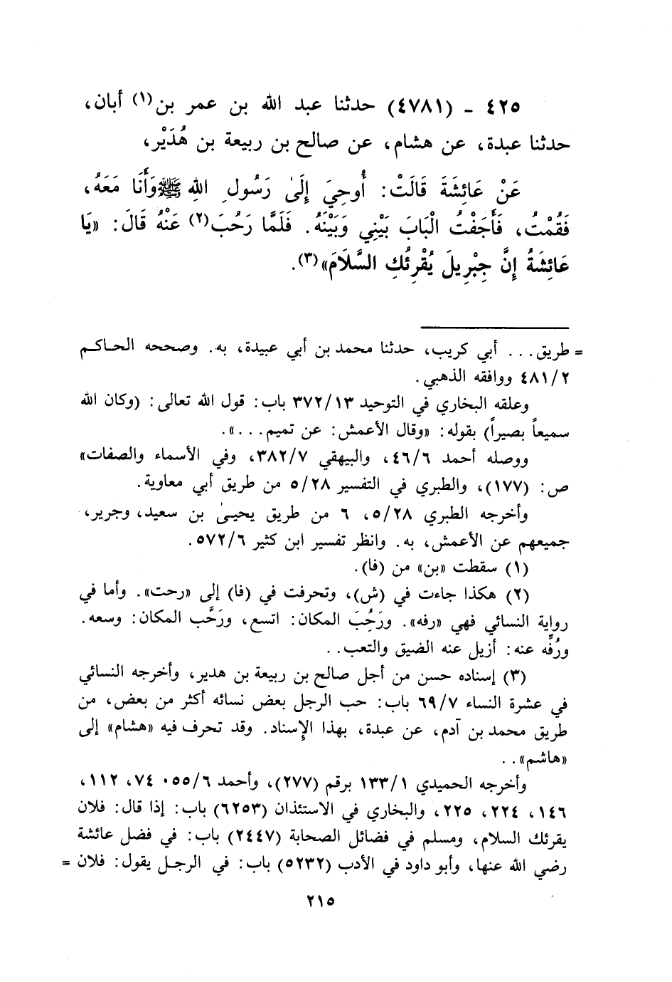 4781 - حَدَّثَنَا عَبْدُ اللَّهِ بْنُ عُمَرَ بْنِ أَبَانَ، حَدَّثَنَا عَبْدَةُ، عَنْ هِشَامٍ، عَنْ صَالِحِ بْنِ رَبِيعَةَ بْنِ هُدَيْرٍ، عَنْ عَائِشَةَ قَالَتْ: أُوحِيَ إِلَى رَسُولِ اللَّهِ صَلَّى اللهُ عَلَيْهِ وَسَلَّمَ وَأَنَا مَعَهُ، فَقُمْتُ فَأَجَفْتُ الْبَابَ بَيْنِي وَبَيْنَهُ، فَلَمَّا رَحُبَ عَنْهُ قَالَ: «§يَا عَائِشَةُ إِنَّ جِبْرِيلَ يُقْرِئُكَ السَّلَامَ» Kإسناده حسن