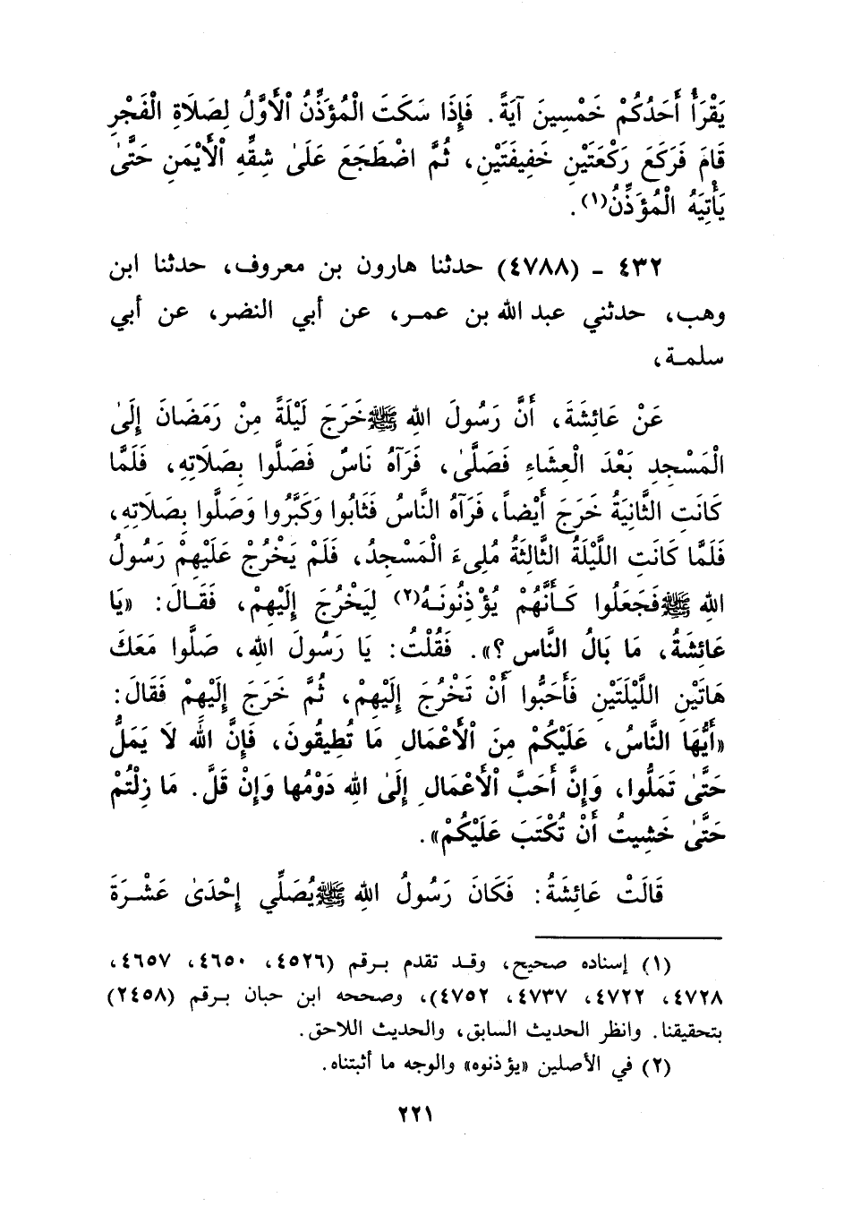 4788 - حَدَّثَنَا هَارُونُ بْنُ مَعْرُوفٍ، حَدَّثَنَا ابْنُ وَهْبٍ، حَدَّثَنِي عَبْدُ اللَّهِ بْنُ عُمَرَ، عَنْ أَبِي النَّضْرِ، عَنْ أَبِي سَلَمَةَ، عَنْ عَائِشَةَ، أَنَّ رَسُولَ اللَّهِ صَلَّى اللهُ عَلَيْهِ وَسَلَّمَ خَرَجَ لَيْلَةً مِنْ رَمَضَانَ إِلَى الْمَسْجِدِ بَعْدَ الْعِشَاءِ فَصَلَّى، فَرَآهُ نَاسٌ فَصَلَّوْا بِصَلَاتِهِ، فَلَمَّا كَانَتِ الثَّانِيَةُ خَرَجَ أَيْضًا، فَرَآهُ النَّاسُ فَثَابُوا وَكَبَّرُوا وَصَلَّوْا بِصَلَاتِهِ، فَلَمَّا كَانَتِ اللَّيْلَةُ الثَّالِثَةُ مُلِئَ الْمَسْجِدُ، فَلَمْ يَخْرُجْ عَلَيْهِمْ رَسُولُ اللَّهِ صَلَّى اللهُ عَلَيْهِ وَسَلَّمَ، فَجَعَلُوا كَأَنَّهُمْ يُؤْذِنُونَهُ لِيَخْرُجَ إِلَيْهِمْ فَقَالَ: «يَا عَائِشَةُ مَا بَالُ النَّاسِ؟» فَقُلْتُ: يَا رَسُولَ اللَّهِ صَلَّوْا مَعَكَ هَاتَيْنِ اللَّيْلَتَيْنِ فَأَحَبُّوا أَنْ تَخْرُجَ إِلَيْهِمْ، ثُمَّ خَرَجَ إِلَيْهِمْ فَقَالَ: «§أَيُّهَا النَّاسُ عَلَيْكُمْ مِنَ الْأَعْمَالِ مَا تُطِيقُونَ؛ فَإِنَّ اللَّهَ لَا يَمَلُّ حَتَّى تَمَلُّوا، وَإِنَّ أَحَبَّ الْأَعْمَالِ إِلَى اللَّهِ دَوْمُهَا وَإِنْ قَلَّ. مَا زِلْتُمْ حَتَّى خَشِيتُ أَنْ تُكْتَبَ عَلَيْكُمْ» قَالَتْ عَائِشَةُ: فَكَانَ رَسُولُ اللَّهِ صَلَّى اللهُ عَلَيْهِ وَسَلَّمَ يُصَلِّي إِحْدَى عَشْرَةَ -[222]- قَائِمًا وَرَكْعَتَيْنِ جَالِسًا، فَإِذَا أَرَادَ أَنْ يَرْكَعَ قَامَ فَقَرَأَ، ثُمَّ رَكَعَ ثُمَّ يُوتِرُ بِوَاحِدَةٍ. قَالَ أَبُو سَلَمَةَ: فَقُلْتُ: كَيْفَ كَانَتْ صَلَاتُهُ فِي شَهْرِ رَمَضَانَ؟ قَالَتْ: مَا كَانَ يَزِيدُ فِي شَهْرِ رَمَضَانَ عَلَى هَذَاKإسناده ضعيف