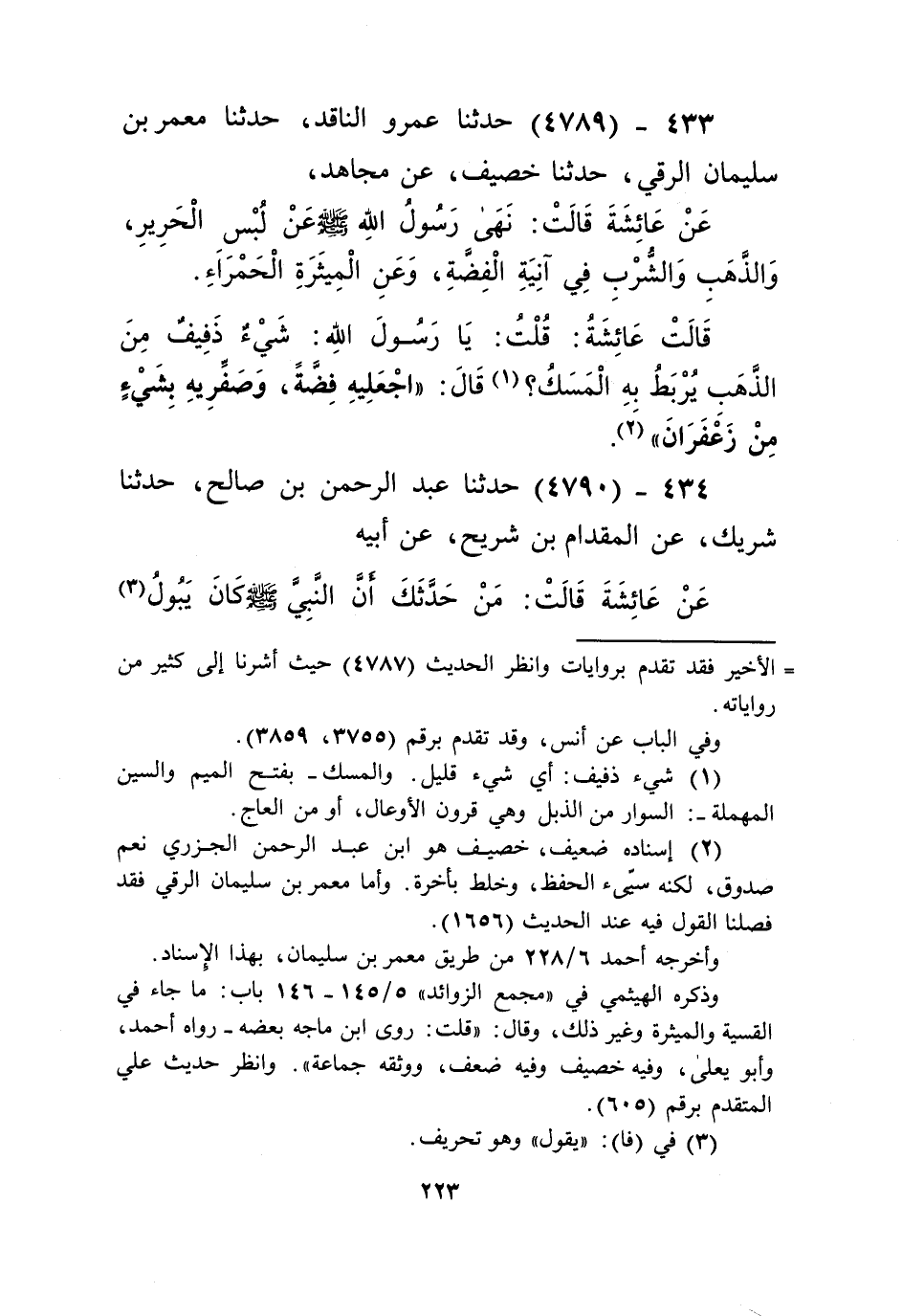 4789 - حَدَّثَنَا عَمْرٌو النَّاقِدُ، حَدَّثَنَا مَعْمَرُّ بْنُ سُلَيْمَانَ الرَّقِّيُّ، حَدَّثَنَا خُصَيْفٌ، عَنْ مُجَاهِدٍ، عَنْ عَائِشَةَ قَالَتْ: «§نَهَى رَسُولُ اللَّهِ صَلَّى اللهُ عَلَيْهِ وَسَلَّمَ عَنْ لُبْسِ الْحَرِيرِ وَالذَّهَبِ وَالشُّرْبِ فِي آنِيَةِ الْفِضَّةِ، وَعَنِ الْمِيثَرَةِ الْحَمْرَاءِ». قَالَتْ عَائِشَةُ: قُلْتُ: يَا رَسُولَ اللَّهِ شَيْءٌ ذَفِيفٌ مِنَ الذَّهَبِ يُرْبَطُ بِهِ الْمَسَكُ؟ قَالَ: «اجْعَلِيهِ فِضَّةً وَصَفِّرِيهِ بشيْءٍ مِنْ زَعْفَرَانَ» Kإسناده ضعيف