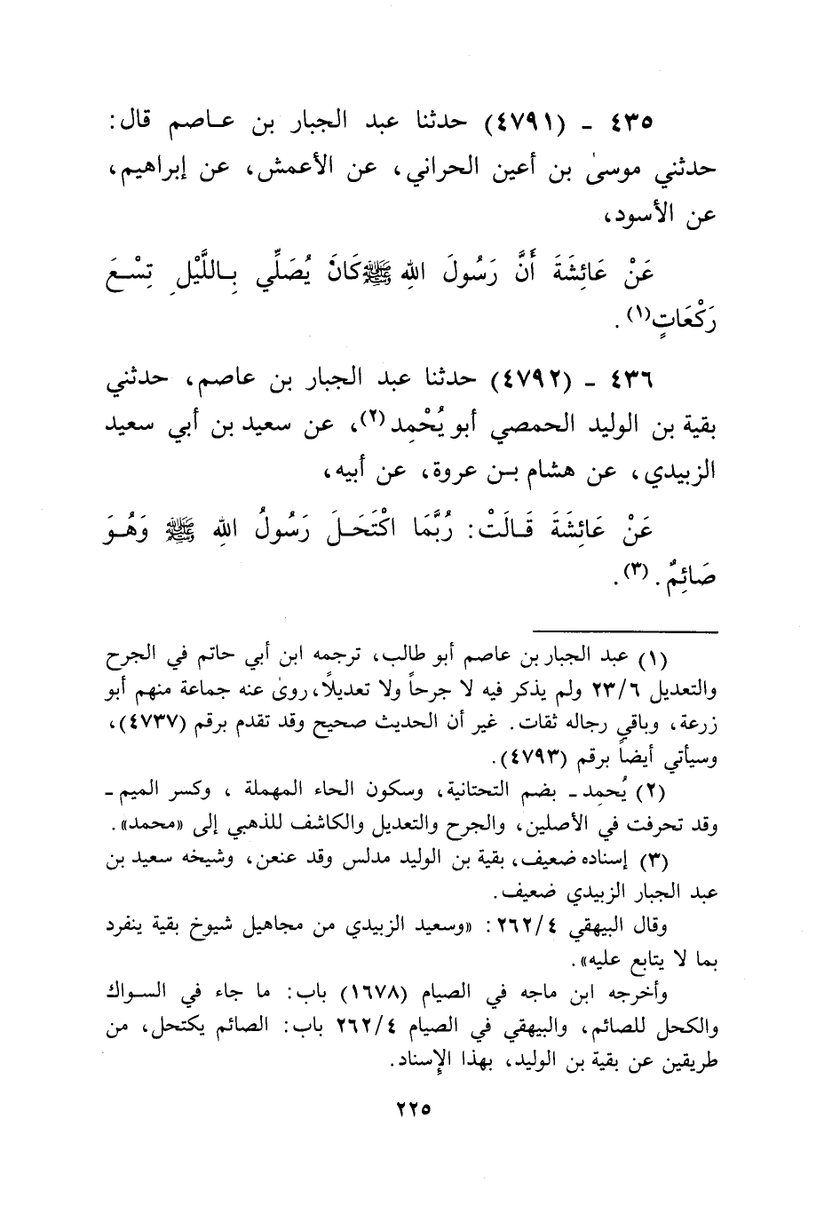 4791 - حَدَّثَنَا عَبْدُ الْجَبَّارِ بْنُ عَاصِمٍ قَالَ: حَدَّثَنِي مُوسَى بْنُ أَعْيَنَ الْحَرَّانِيُّ، عَنِ الْأَعْمَشِ، عَنْ إِبْرَاهِيمَ، عَنِ الْأَسْوَدِ، عَنْ عَائِشَةَ، أَنَّ رَسُولَ اللَّهِ صَلَّى اللهُ عَلَيْهِ وَسَلَّمَ «§كَانَ يُصَلِّي بِاللَّيْلِ تِسْعَ رَكَعَاتٍ»