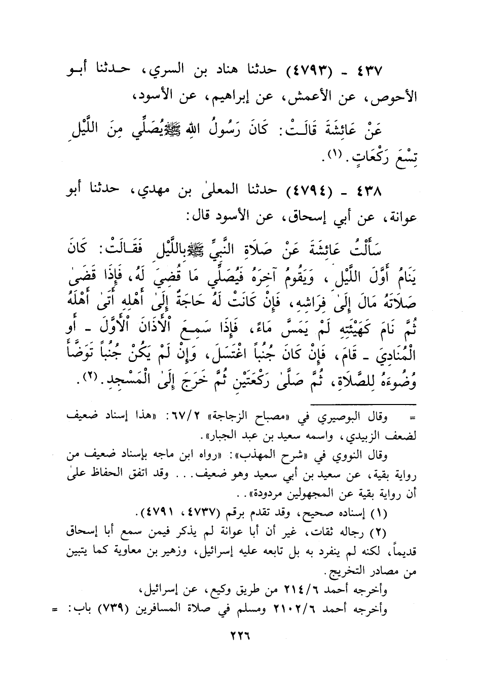4793 - حَدَّثَنَا هَنَّادُ بْنُ السَّرِيِّ، حَدَّثَنَا أَبُو الْأَحْوَصِ، عَنِ الْأَعْمَشِ، عَنْ إِبْرَاهِيمَ، عَنِ الْأَسْوَدِ، عَنْ عَائِشَةَ قَالَتْ: كَانَ رَسُولُ اللَّهِ صَلَّى اللهُ عَلَيْهِ وَسَلَّمَ «§يُصَلِّي مِنَ اللَّيْلِ تِسْعَ رَكَعَاتٍ» Kإسناده صحيح