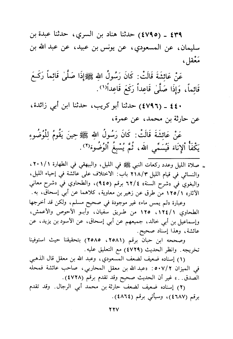 4795 - حَدَّثَنَا هَنَّادُ بْنُ السَّرِيِّ، حَدَّثَنَا عَبْدَةُ بْنُ سُلَيْمَانَ، عَنِ الْمَسْعُودِيِّ، عَنْ يُونُسَ بْنِ عُبَيْدٍ، عَنْ عَبْدِ اللَّهِ بْنِ مَعْقِلٍ، عَنْ عَائِشَةَ قَالَتْ: كَانَ رَسُولُ اللَّهِ صَلَّى اللهُ عَلَيْهِ وَسَلَّمَ «§إِذَا صَلَّى قَائِمًا رَكَعَ قَائِمًا، وَإِذَا صَلَّى قَاعِدًا رَكَعَ قَاعِدًا» Kإسناده ضعيف