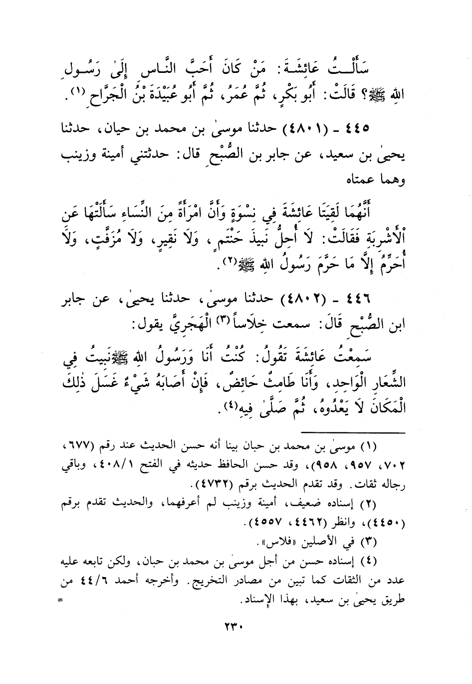 4801 - حَدَّثَنَا مُوسَى بْنُ مُحَمَّدِ بْنِ حَيَّانَ، حَدَّثَنَا يَحْيَى بْنُ سَعِيدٍ، عَنْ جَابِرِ بْنِ الصُّبْحِ قَالَ: حَدَّثَتْنِي أُمَيْنَةُ، وَزَيْنَبُ وَهُمَا عَمَّتَاهُ أَنَّهُمَا لَقِيَتَا عَائِشَةَ فِي نِسْوَةٍ وَأَنَّ امْرَأَةً مِنَ النِّسَاءِ سَأَلَتْهَا عَنِ الْأَشْرِبَةِ، فَقَالَتْ: «§لَا أُحِلُّ نَبِيذَ حَنْتَمٍ وَلَا نَقِيرٍ وَلَا مُزَفَّتٍ، وَلَا أُحَرِّمُ إِلَّا مَا حَرَّمَ رَسُولُ اللَّهِ صَلَّى اللهُ عَلَيْهِ وَسَلَّمَ» Kإسناده ضعيف