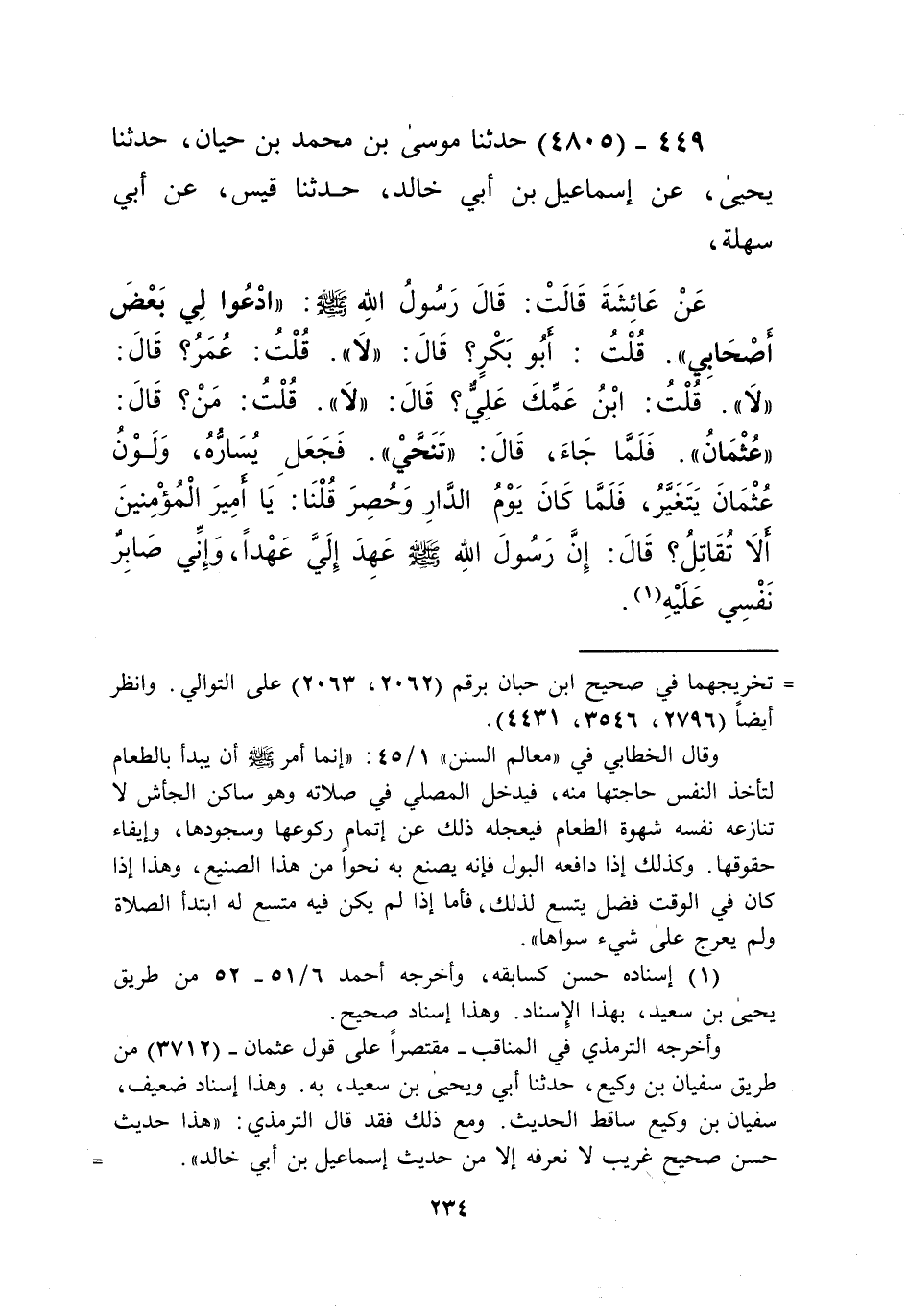 4805 - حَدَّثَنَا مُوسَى بْنُ مُحَمَّدِ بْنِ حَيَّانَ، حَدَّثَنَا يَحْيَى، عَنْ إِسْمَاعِيلَ بْنِ أَبِي خَالِدٍ، حَدَّثَنَا قَيْسٌ، عَنْ أَبِي سَهْلَةَ، عَنْ عَائِشَةَ قَالَتْ: قَالَ رَسُولُ اللَّهِ صَلَّى اللهُ عَلَيْهِ وَسَلَّمَ: «§ادْعُوا لِي بَعْضَ أَصْحَابِي». قُلْتُ: أَبُو بَكْرٍ؟ قَالَ: «لَا». قُلْتُ: عُمَرُ؟ قَالَ: «لَا». قُلْتُ: ابْنُ عَمِّكَ عَلَيٌّ؟ قَالَ: «لَا». قُلْتُ: مَنْ؟ قَالَ: «عُثْمَانُ». فَلَمَّا جَاءَ قَالَ: «تَنَحَّيْ». فَجَعَلَ يُسَارُّهُ، وَلَوْنُ عُثْمَانَ يَتَغَيَّرُ. فَلَمَّا كَانَ يَوْمُ الدَّارِ وَحُصِرَ قُلْنَا: يَا أَمِيرَ الْمُؤْمِنِينَ أَلَا تُقَاتِلُ؟ قَالَ: إِنَّ رَسُولَ اللَّهِ صَلَّى اللهُ عَلَيْهِ وَسَلَّمَ عَهِدَ إِلَيَّ عَهْدًا، وَإِنِّي صَابِرٌ نَفْسِي عَلَيْهِ "Kإسناده حسن