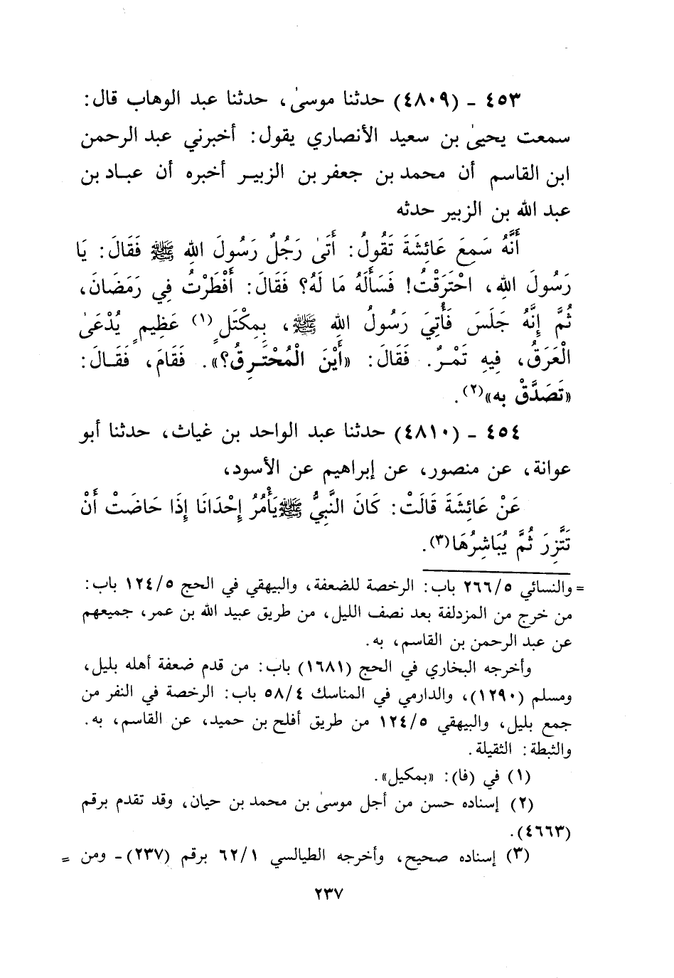 4809 - حَدَّثَنَا مُوسَى، حَدَّثَنَا عَبْدُ الْوَهَّابِ، قَالَ: سَمِعْتُ يَحْيَى بْنَ سَعِيدٍ الْأَنْصَارِيَّ يَقُولُ: أَخْبَرَنِي عَبْدُ الرَّحْمَنِ بْنُ الْقَاسِمِ، أَنَّ مُحَمَّدَ بْنَ جَعْفَرِ بْنِ الزُّبَيْرِ، أَخْبَرَهُ، أَنَّ عَبَّادَ بْنَ عَبْدِ اللَّهِ بْنِ الزُّبَيْرِ حَدَّثَهُ، أَنَّهُ، سَمِعَ عَائِشَةَ تَقُولُ: أَتَى رَجُلٌ رَسُولَ اللَّهِ صَلَّى اللهُ عَلَيْهِ وَسَلَّمَ فَقَالَ: " §يَا رَسُولَ اللَّهِ احْتَرَقْتُ فَسَأَلَهُ مَا لَهُ؟ فَقَالَ: أَفْطَرْتُ فِي رَمَضَانَ. ثُمَّ إِنَّهُ جَلَسَ، فَأُتِيَ رَسُولَ اللَّهِ صَلَّى اللهُ عَلَيْهِ وَسَلَّمَ بِمِكْتَلٍ عَظِيمٍ يُدْعَى الْعَرَقَ فِيهِ تَمْرٌ. فَقَالَ: «أَيْنَ الْمُحْتَرِقُ؟» فَقَامَ. فَقَالَ: «تَصَدَّقْ بِهِ» Kإسناده حسن