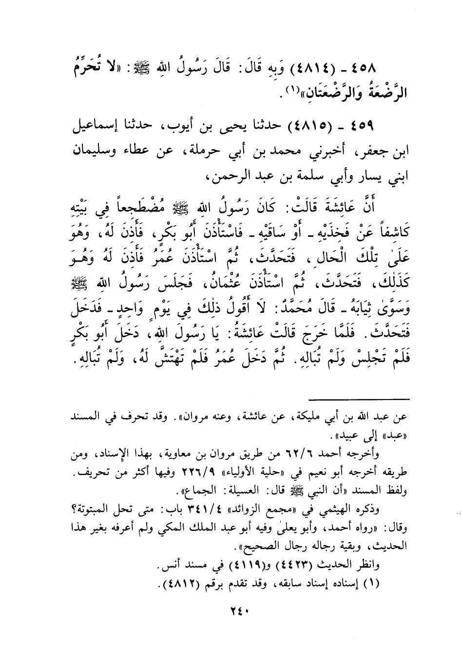 4815 - حَدَّثَنَا يَحْيَى بْنُ أَيُّوبَ، حَدَّثَنَا إِسْمَاعِيلُ بْنُ جَعْفَرٍ، أَخْبَرَنِي مُحَمَّدُ بْنُ أَبِي حَرْمَلَةَ، عَنْ عَطَاءٍ، وَسُلَيْمَانَ ابْنَيْ يَسَارٍ وَأَبِي سَلَمَةَ بْنِ عَبْدِ الرَّحْمَنِ، أَنَّ عَائِشَةَ قَالَتْ: " §كَانَ رَسُولُ اللَّهِ صَلَّى اللهُ عَلَيْهِ وَسَلَّمَ مُضْطَجِعًا فِي بَيْتِهِ كَاشِفًا عَنْ فَخِذَيْهِ - أَوْ سَاقَيْهِ - فَاسْتَأْذَنَ أَبُو بَكْرٍ فَأَذِنَ لَهُ وَهُوَ عَلَى تِلْكَ الْحَالِ، فَتَحَدَّثَ، ثُمَّ اسْتَأْذَنَ عُمَرُ فَأَذِنَ لَهُ وَهُوَ كَذَلِكَ فَتَحَدَّثَ، ثُمَّ اسْتَأْذَنَ عُثْمَانُ فَجَلَسَ رَسُولُ اللَّهِ صَلَّى اللهُ عَلَيْهِ وَسَلَّمَ وَسَوَّى ثِيَابَهُ - قَالَ مُحَمَّدٌ: لَا أَقُولُ ذَلِكَ فِي يَوْمٍ وَاحِدٍ - فَدَخَلَ فَتَحَدَّثَ. فَلَمَّا خَرَجَ قَالَتْ عَائِشَةُ: يَا رَسُولَ اللَّهِ دَخَلَ أَبُو بَكْرٍ فَلَمْ تَجْلِسْ وَلَمْ تُبَالِهِ، ثُمَّ دَخَلَ عُمَرُ فَلَمْ تَهْتَشَّ لَهُ وَلَمْ تُبَالِهِ، ثُمَّ دَخَلَ عُثْمَانُ فَجَلَسْتَ وَسَوَّيْتَ ثِيَابَكَ. فَقَالَ: «أَلَا أَسْتَحِي مِنْ رَجُلٍ تَسْتَحِي مِنْهُ الْمَلَائِكَةُ» Kإسناده صحيح