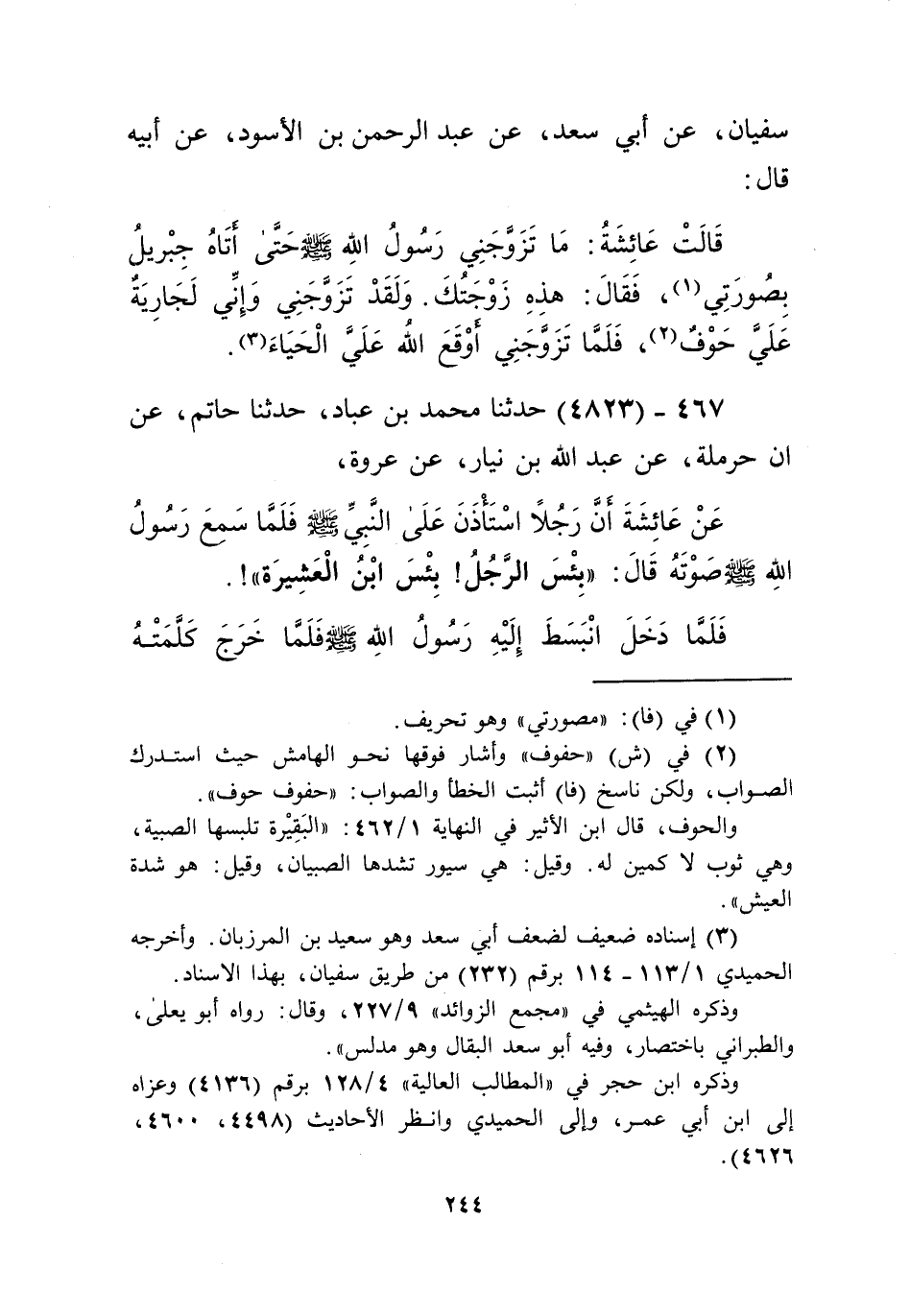4823 - حَدَّثَنَا مُحَمَّدُ بْنُ عَبَّادٍ، حَدَّثَنَا حَاتِمٌ، عَنِ ابْنِ حَرْمَلَةَ، عَنْ عَبْدِ اللَّهِ بْنِ نِيَارٍ، عَنْ عُرْوَةَ، عَنْ عَائِشَةَ، أَنَّ " رَجُلًا اسْتَأْذَنَ عَلَى النَّبِيِّ صَلَّى اللهُ عَلَيْهِ وَسَلَّمَ، فَلَمَّا سَمِعَ رَسُولُ اللَّهِ صَلَّى اللهُ عَلَيْهِ وَسَلَّمَ صَوْتَهُ قَالَ: «§بِئْسَ الرَّجُلُ بِئْسَ ابْنُ الْعَشِيرَةِ» فَلَمَّا دَخَلَ انْبَسَطَ إِلَيْهِ رَسُولُ اللَّهِ صَلَّى اللهُ عَلَيْهِ وَسَلَّمَ، فَلَمَّا خَرَجَ كَلَّمَتْهُ عَائِشَةُ فَقَالَتْ: يَا رَسُولَ اللَّهِ قُلْتَ: بِئْسَ الرَّجُلُ بِئْسَ ابْنُ الْعَشِيرَةِ فَلَمَّا دَخَلَ انْبَسَطْتَ إِلَيْهِ؟ قَالَ: «يَا عَائِشَةُ إِنَّ مِنْ شِرَارِ النَّاسِ مَنِ اتُّقِيَ فُحْشُهُ» Kإسناده صحيح