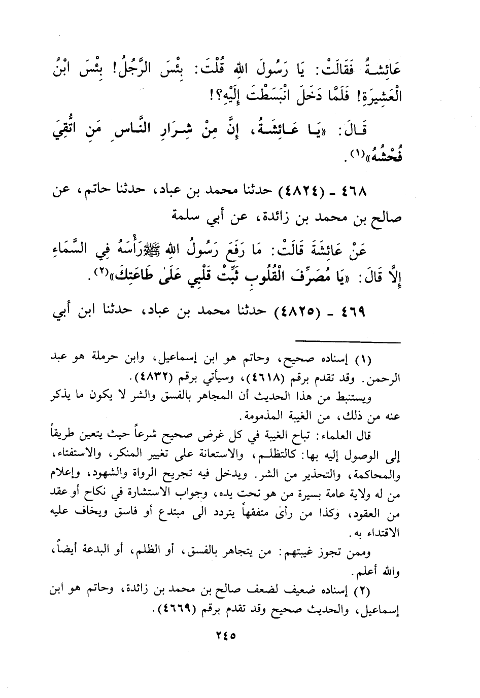 4824 - حَدَّثَنَا مُحَمَّدُ بْنُ عَبَّادٍ، حَدَّثَنَا حَاتِمٌ، عَنْ صَالِحِ بْنِ مُحَمَّدِ بْنِ زَائِدَةَ، عَنْ أَبِي سَلَمَةَ، عَنْ عَائِشَةَ قَالَتْ: " مَا رَفَعَ رَسُولُ اللَّهِ صَلَّى اللهُ عَلَيْهِ وَسَلَّمَ رَأْسَهُ فِي السَّمَاءِ إِلَّا قَالَ: «§يَا مُصَرِّفَ الْقُلُوبِ ثَبِّتْ قَلْبِي عَلَى طَاعَتِكَ» Kإسناده ضعيف والحديث صحيح