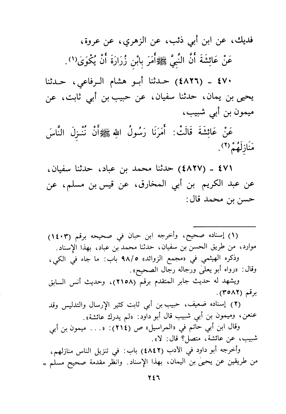 4826 - حَدَّثَنَا أَبُو هِشَامٍ الرِّفَاعِيُّ، حَدَّثَنَا يَحْيَى بْنُ يَمَانٍ، حَدَّثَنَا سُفْيَانُ، عَنْ حَبِيبِ بْنِ أَبِي ثَابِتٍ، عَنْ مَيْمُونِ بْنِ أَبِي شَبِيبٍ، عَنْ عَائِشَةَ قَالَتْ: «§أَمَرَنَا رَسُولُ اللَّهِ صَلَّى اللهُ عَلَيْهِ وَسَلَّمَ أَنْ نُنْزِلَ النَّاسَ مَنَازِلَهُمْ» Kإسناده ضعيف