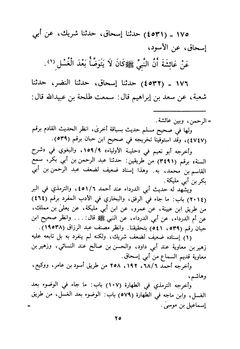 4531 - حَدَّثَنَا إِسْحَاقُ، حَدَّثَنَا شَرِيكٌ، عَنْ أَبِي إِسْحَاقَ، عَنِ الْأَسْوَدِ، عَنْ عَائِشَةَ أَنَّ النَّبِيَّ صَلَّى اللهُ عَلَيْهِ وَسَلَّمَ كَانَ «§لَا يَتَوَضَّأُ بَعْدَ الْغُسْلِ» Kإسناده ضعيف