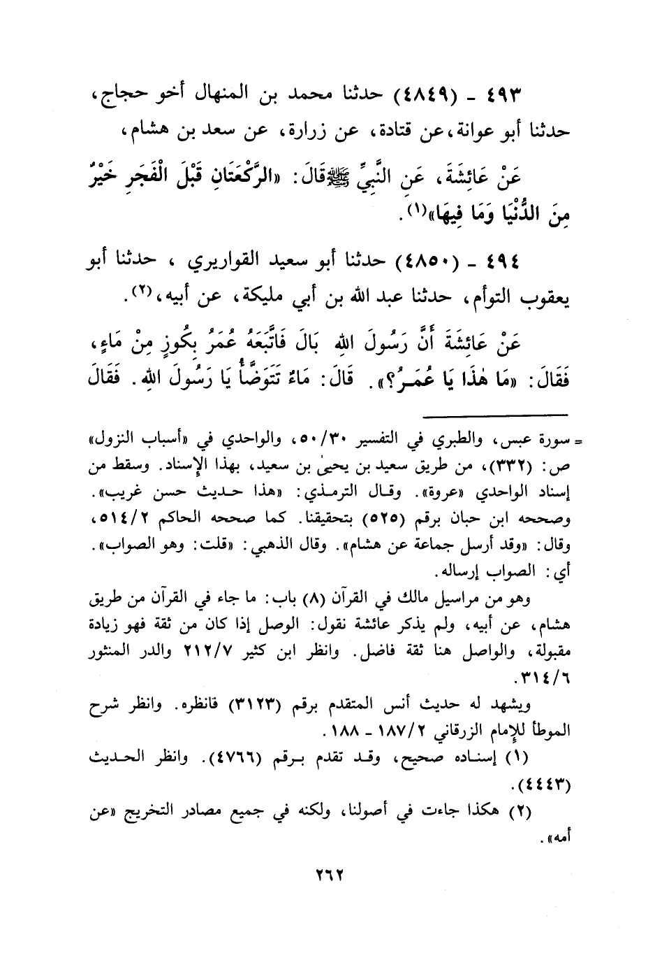 4849 - حَدَّثَنَا مُحَمَّدُ بْنُ الْمِنْهَالِ أَخُو حَجَّاجٍ، حَدَّثَنَا أَبُو عَوَانَةَ، عَنْ قَتَادَةَ، عَنْ زُرَارَةَ، عَنْ سَعْدِ بْنِ هِشَامٍ، عَنْ عَائِشَةَ، عَنِ النَّبِيِّ صَلَّى اللهُ عَلَيْهِ وَسَلَّمَ قَالَ: «§الرَّكْعَتَانِ قَبْلَ الْفَجْرِ خَيْرٌ مِنَ الدُّنْيَا وَمَا فِيهَا» Kإسناده صحيح