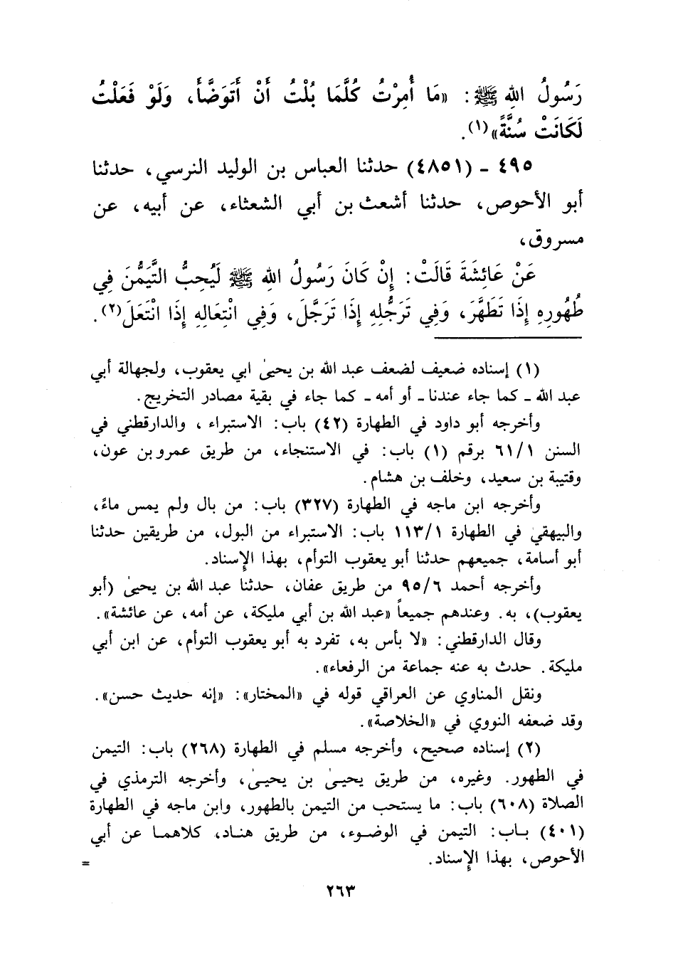 4851 - حَدَّثَنَا الْعَبَّاسُ بْنُ الْوَلِيدِ النَّرْسِيُّ، حَدَّثَنَا أَبُو الْأَحْوَصِ، حَدَّثَنَا أَشْعَثُ بْنُ أَبِي الشَّعْثَاءِ، عَنْ أَبِيهِ، عَنْ مَسْرُوقٍ، عَنْ عَائِشَةَ قَالَتْ: إِنْ كَانَ رَسُولُ اللَّهِ صَلَّى اللهُ عَلَيْهِ وَسَلَّمَ «§لَيُحِبُّ التَّيَمُّنَ فِي طُهُورِهِ إِذَا تَطَهَّرَ، وَفِي تَرَجُّلِهِ إِذَا تَرَجَّلَ، وَفِي انْتِعَالِهِ إِذَا انْتَعَلَ» Kإسناده صحيح