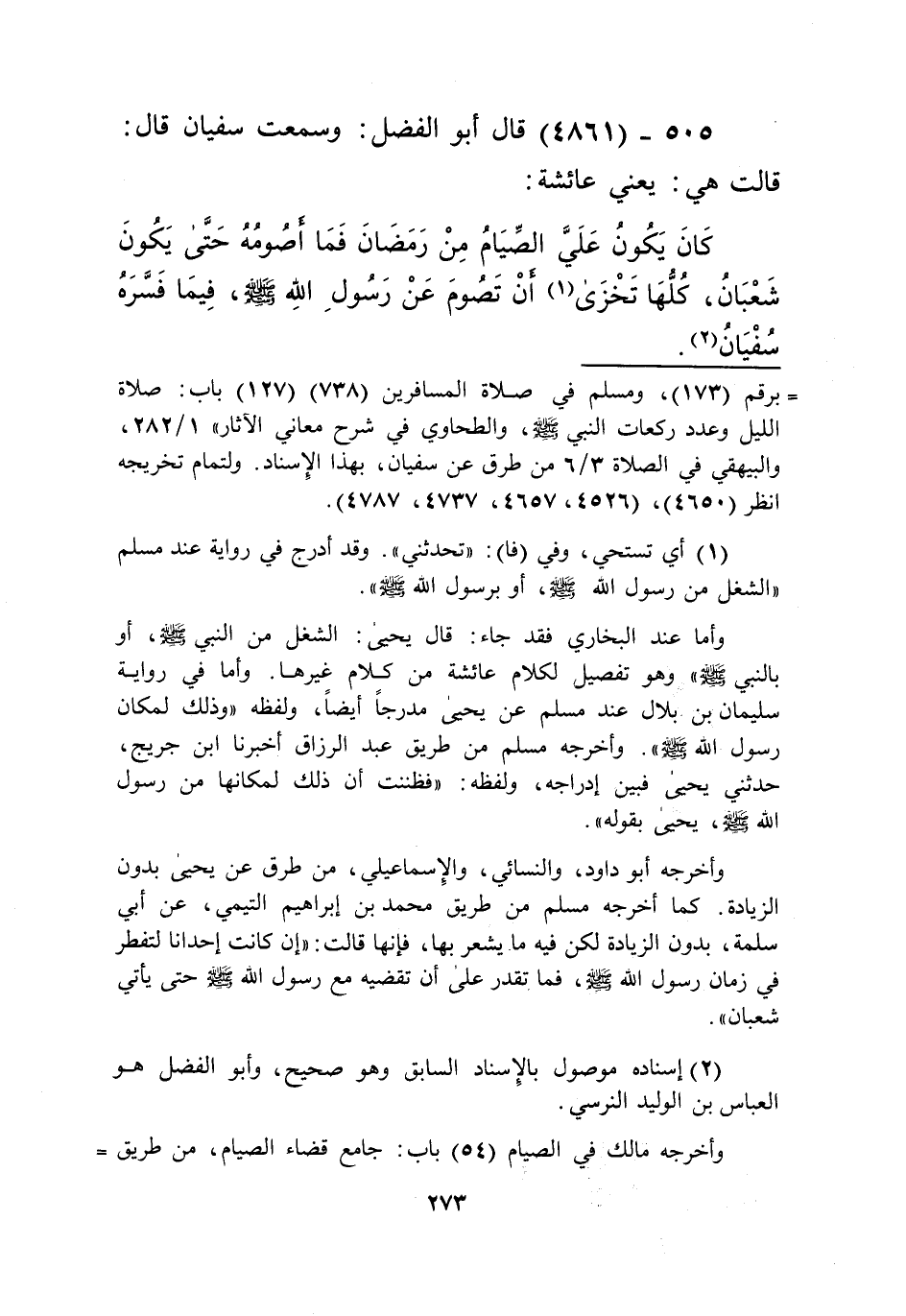 4861 - قَالَ أَبُو الْفَضْلِ: وَسَمِعْتُ سُفْيَانَ قَالَ: قَالَتْ هِيَ يَعْنِي عَائِشَةَ: «§كَانَ يَكُونُ عَلَيَّ الصِّيَامُ مِنْ رَمَضَانَ، فَمَا أَصُومُهُ حَتَّى يَكُونَ شَعْبَانُ». كُلُّهَا تَخْزَى أَنْ تَصُومَ عَنْ رَسُولِ اللَّهِ صَلَّى اللهُ عَلَيْهِ وَسَلَّمَ فِيمَا فَسَّرَهُ سُفْيَانُKإسناده صحيح