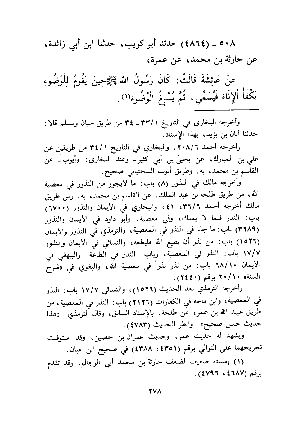 4864 - حَدَّثَنَا أَبُو كُرَيْبٍ، حَدَّثَنَا ابْنُ أَبِي زَائِدَةَ، عَنْ حَارِثَةَ بْنِ مُحَمَّدٍ، عَنْ عَمْرَةَ، عَنْ عَائِشَةَ قَالَتْ: كَانَ رَسُولُ اللَّهِ صَلَّى اللهُ عَلَيْهِ وَسَلَّمَ حِينَ «§يَقُومُ لِلْوُضُوءِ يَكْفَأُ الْإِنَاءَ فَيُسَمِّي، ثُمَّ يُسْبِغُ الْوُضُوءَ» Kإسناده ضعيف