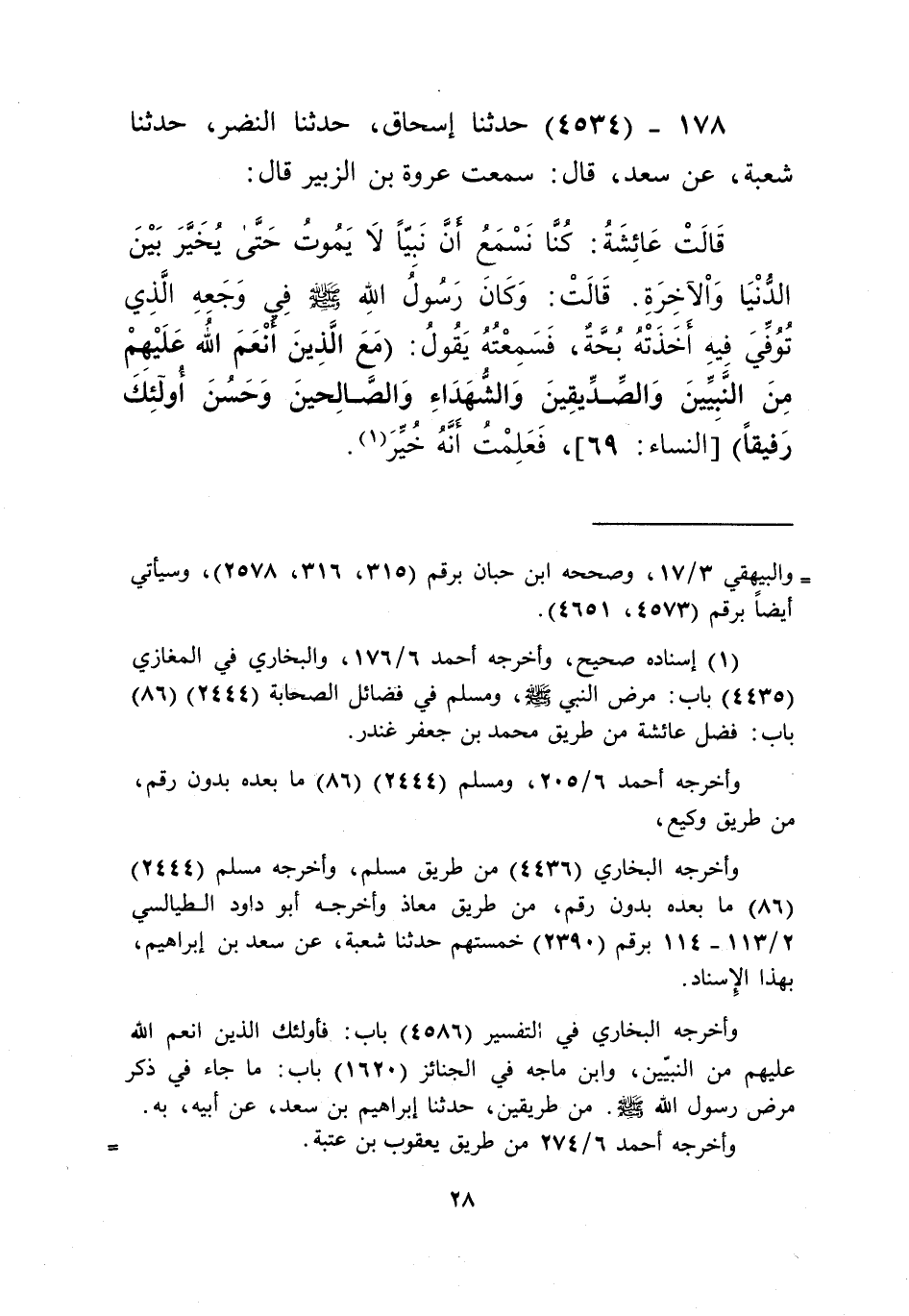 4534 - حَدَّثَنَا إِسْحَاقُ، حَدَّثَنَا النَّضْرُ، حَدَّثَنَا شُعْبَةُ، عَنْ سَعْدٍ قَالَ: سَمِعْتُ عُرْوَةَ بْنَ الزُّبَيْرِ قَالَ: قَالَتْ عَائِشَةُ: " §كُنَّا نَسْمَعُ أَنَّ نَبِيًّا لَا يَمُوتُ حَتَّى يُخَيَّرَ بَيْنَ الدُّنْيَا وَالْآخِرَةِ. قَالَتْ: وَكَانَ رَسُولُ اللَّهِ صَلَّى اللهُ عَلَيْهِ وَسَلَّمَ فِي وَجَعِهِ الَّذِي تُوُفِّيَ فِيهِ أَخَذَتْهُ بُحَّةٌ، فَسَمِعْتُهُ يَقُولُ: {مَعَ الَّذِينَ أَنْعَمَ اللَّهُ عَلَيْهِمْ مِنَ النَّبِيِّينَ وَالصِّدِّيقِينَ وَالشُّهَدَاءِ وَالصَّالِحِينَ وَحَسُنَ أُولَئِكَ رَفِيقًا} [النساء: 69] فَعَلِمْتُ أَنَّهُ خُيِّرَ "Kإسناده صحيح