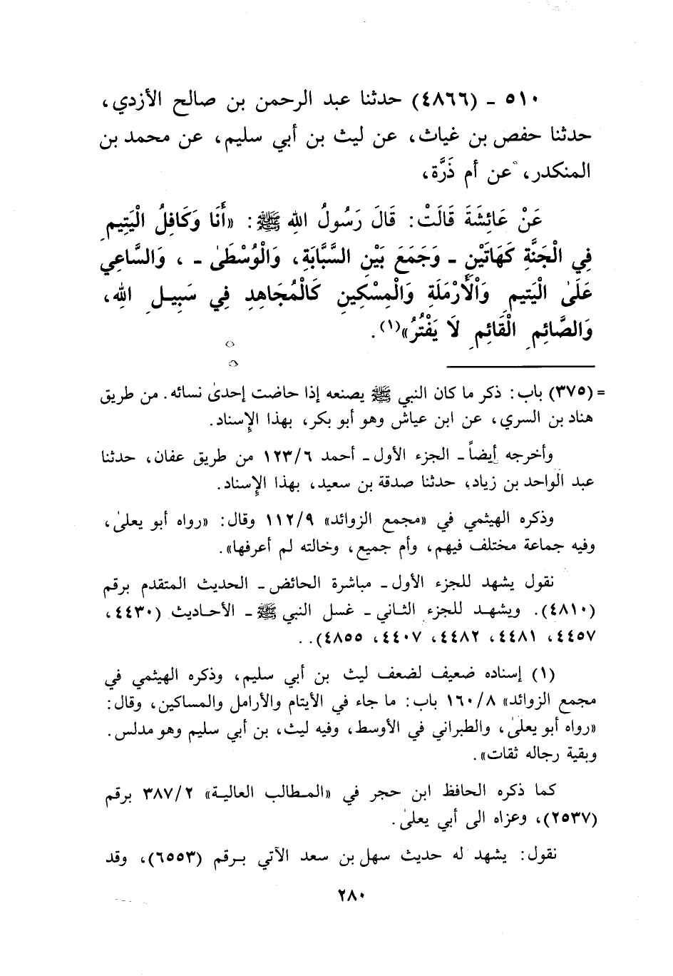 4866 - حَدَّثَنَا عَبْدُ الرَّحْمَنِ بْنُ صَالِحٍ الْأَزْدِيُّ، حَدَّثَنَا حَفْصُ بْنُ غِيَاثٍ، عَنْ لَيْثِ بْنِ أَبِي سُلَيْمٍ، عَنْ مُحَمَّدِ بْنِ الْمُنْكَدِرِ، عَنْ أُمِّ ذَرَّةٍ، عَنْ عَائِشَةَ قَالَتْ: قَالَ رَسُولُ اللَّهِ صَلَّى اللهُ عَلَيْهِ وَسَلَّمَ: «§أَنَا وَكَافِلُ الْيَتِيمِ فِي الْجَنَّةِ كَهَاتَيْنِ - وَجَمَعَ بَيْنَ السَّبَّابَةِ وَالْوُسْطَى - وَالسَّاعِي عَلَى الْيَتِيمِ وَالْأَرْمَلَةِ وَالْمِسْكِينِ كَالْمُجَاهِدِ فِي سَبِيلِ اللَّهِ وَالصَّائِمِ الْقَائِمِ لَا يَفْتُرُ» Kإسناده ضعيف