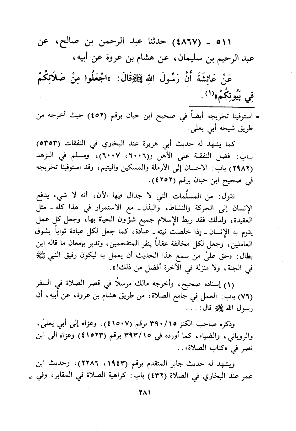 4867 - حَدَّثَنَا عَبْدُ الرَّحْمَنِ بْنُ صَالِحٍ، عَنْ عَبْدِ الرَّحِيمِ بْنِ سُلَيْمَانَ، عَنْ هِشَامِ بْنِ عُرْوَةَ، عَنْ أَبِيهِ، عَنْ عَائِشَةَ، أَنَّ رَسُولَ اللَّهِ صَلَّى اللهُ عَلَيْهِ وَسَلَّمَ قَالَ: «§اجْعَلُوا مِنْ صَلَاتِكُمْ فِي بُيُوتِكُمْ» Kإسناده صحيح