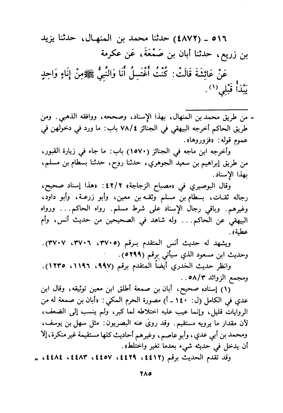 4872 - حَدَّثَنَا مُحَمَّدُ بْنُ الْمِنْهَالِ، حَدَّثَنَا يَزِيدُ بْنُ زُرَيْعٍ، حَدَّثَنَا أَبَانُ بْنُ صَمْعَةَ، عَنْ عِكْرِمَةَ، عَنْ عَائِشَةَ قَالَتْ: «§كُنْتُ أَغْتَسِلُ أَنَا وَالنَّبِيُّ صَلَّى اللهُ عَلَيْهِ وَسَلَّمَ مِنْ إِنَاءٍ وَاحِدٍ، يَبْدَأُ قَبْلِي» Kإسناده صحيح