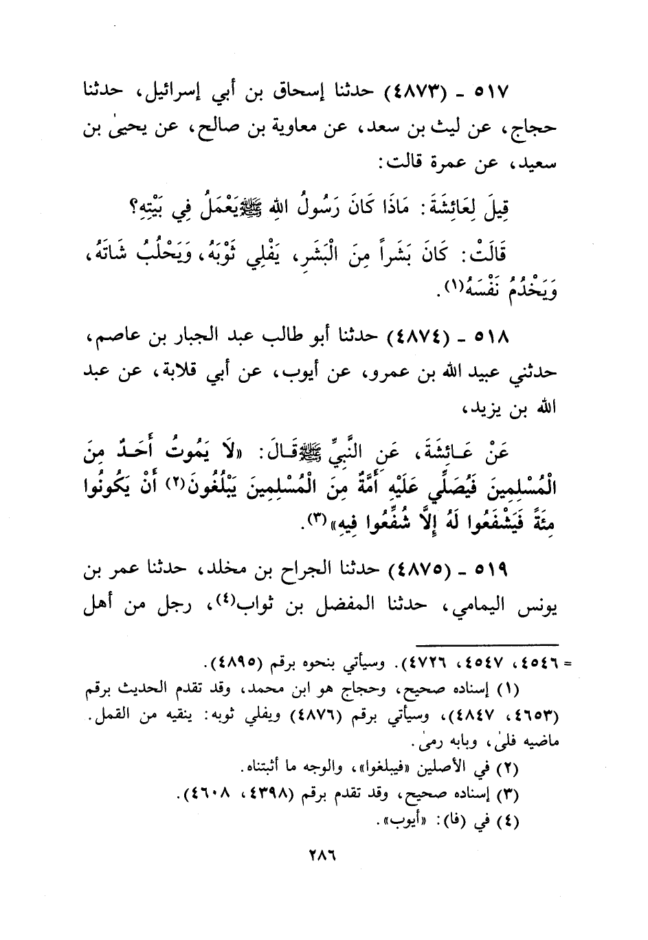 4873 - حَدَّثَنَا إِسْحَاقُ بْنُ أَبِي إِسْرَائِيلَ، حَدَّثَنَا حَجَّاجٌ، عَنْ لَيْثِ بْنِ سَعْدٍ، عَنْ مُعَاوِيَةَ بْنِ صَالِحٍ، عَنْ يَحْيَى بْنِ سَعِيدٍ، عَنْ عَمْرَةَ قَالَتْ: قِيلَ لِعَائِشَةَ: مَاذَا كَانَ رَسُولُ اللَّهِ صَلَّى اللهُ عَلَيْهِ وَسَلَّمَ يَعْمَلُ فِي بَيْتِهِ؟ قَالَتْ: «§كَانَ بَشَرًا مِنَ الْبَشَرِ، يَفْلِي ثَوْبَهُ، وَيَحْلِبُ شَاتَهُ، وَيَخْدُمُ نَفْسَهُ» Kإسناده صحيح